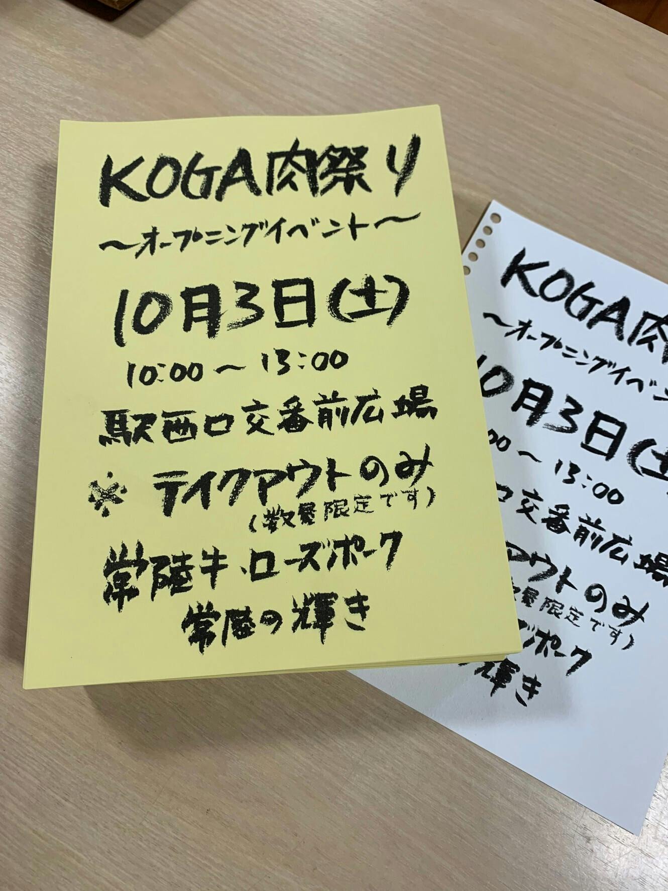 今年の開催も楽しみにしているというお客様からの声も多くあった中今回はこのような形での開催となりますがKOGA肉祭りというイベントがたくさんの人に楽しみにしていただけるイベントとして続いていけるように、また有志で立ち上げた会にできることは限られていますが、肉祭り実行委員会として「肉」の括りの中ではありますが参加していただく飲食店(惣菜店含む)にておいしいお肉メニューを店内飲食又はテイクアウトで楽しんでいただくことで地元飲食店、生産者を応援できればという思いです