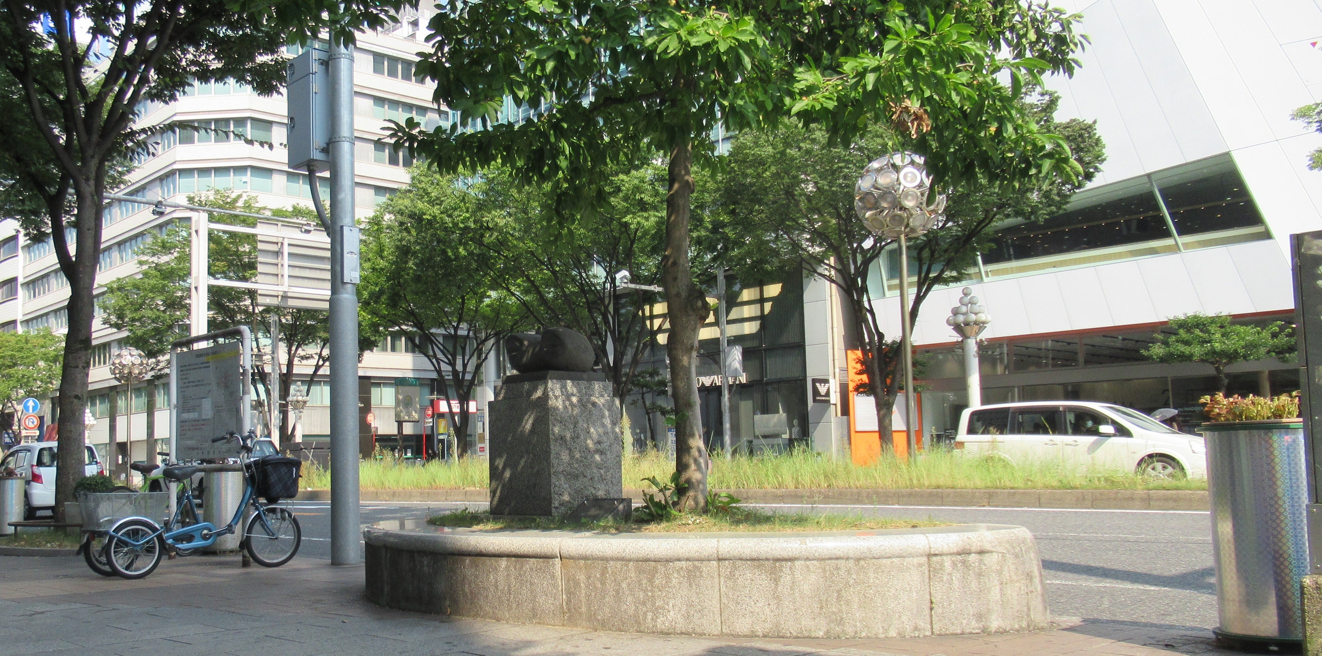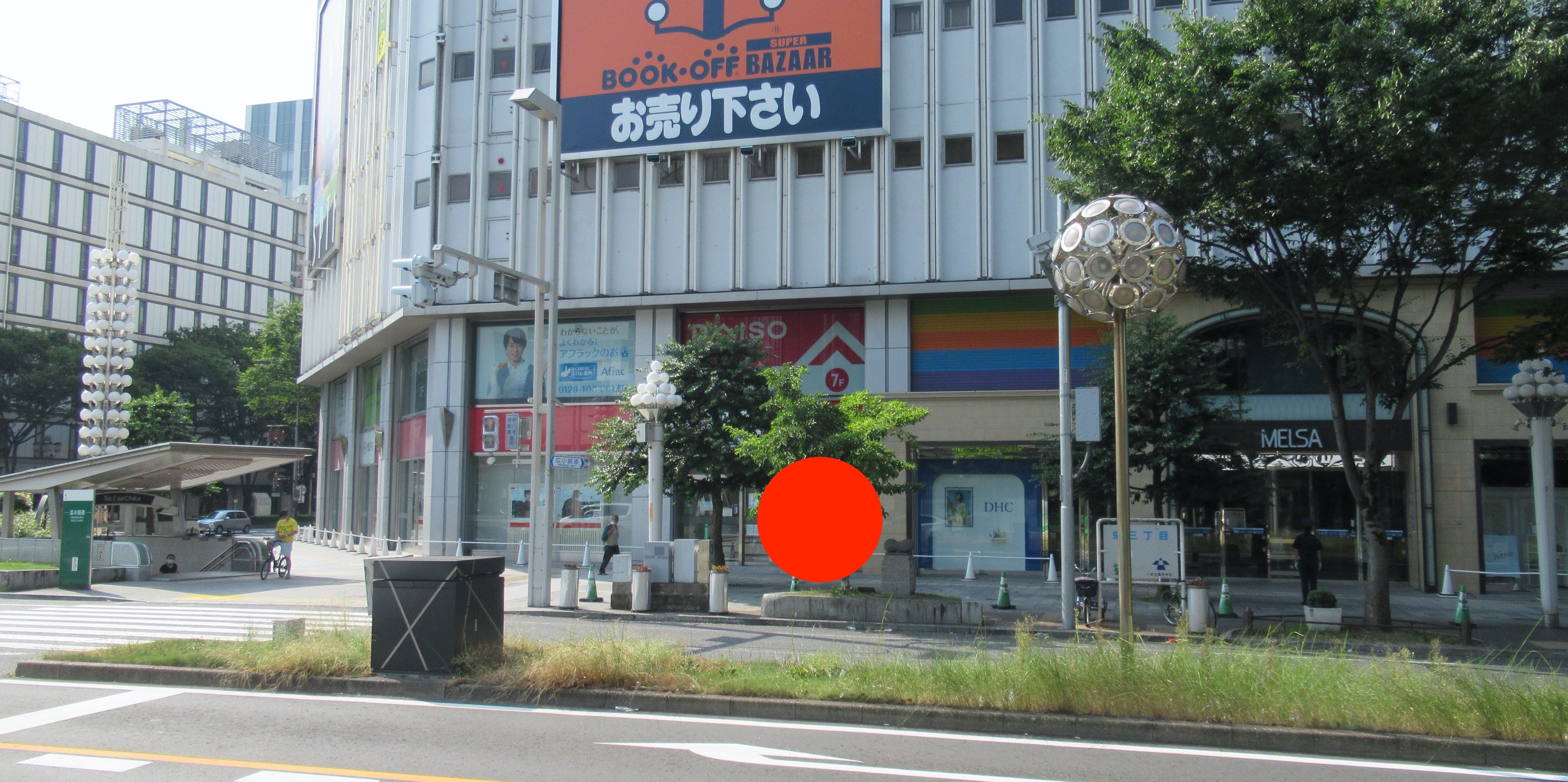 名古屋市栄交差点の西南角の歩道(栄スカイルビル三菱UFJ銀行前)。乱歩旧居跡に近い公共スペースです。
