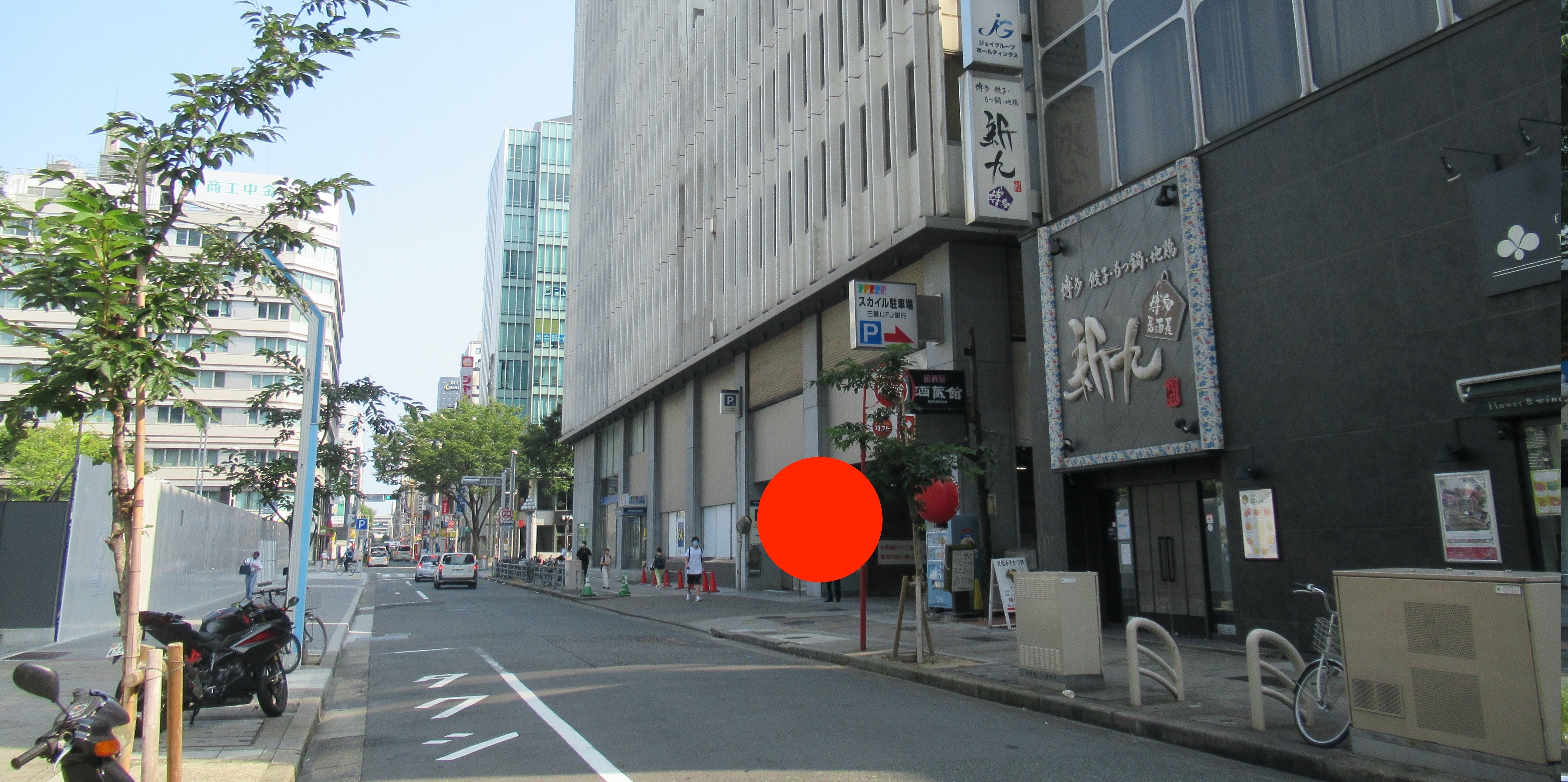 記念碑建設予定地から数十メートルの旧居跡現状 赤丸付近が旧居跡(スカイルビル駐車場入口付近)