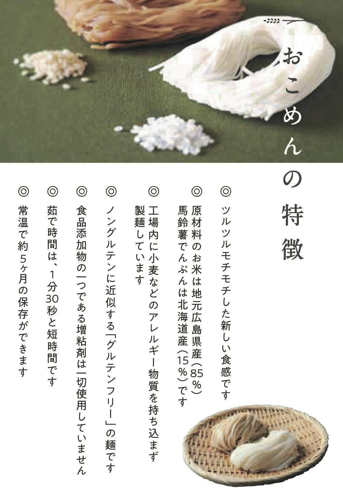 「おこめん」は、広島県産のお米からつくった米粉と少しだけジャガイモの澱粉を合わせて作ったお米の麺です。