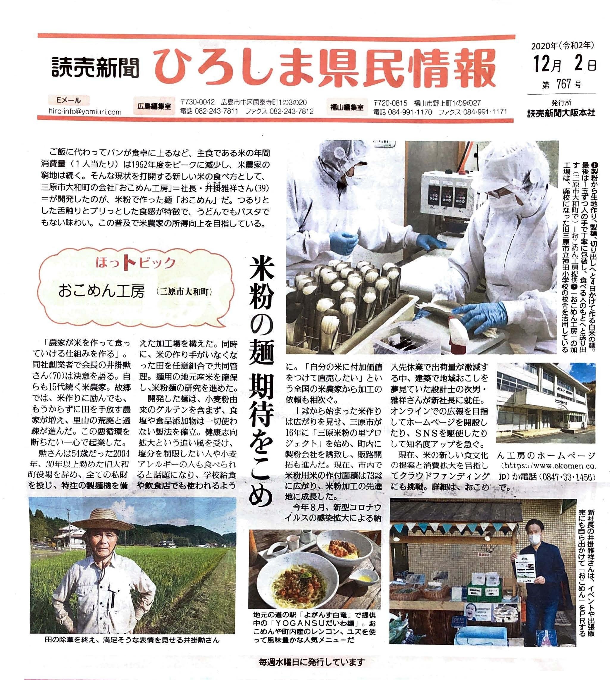 こんにちは!おこめん工房の井掛です!ご支援ご協力いただいております、皆さまありがとうございます!この度、「読売新聞ひろしま県民情報」に掲載されました!!ありがとうございます!!取材時は想いだけが先走り、まとまりのない話でしたが、とても分かりやすい文章に落とし込んで頂きました。伊勢本さま、誠にありがとうございます!是非、拝読頂けましたら幸いです。会社のURLはこちら!!