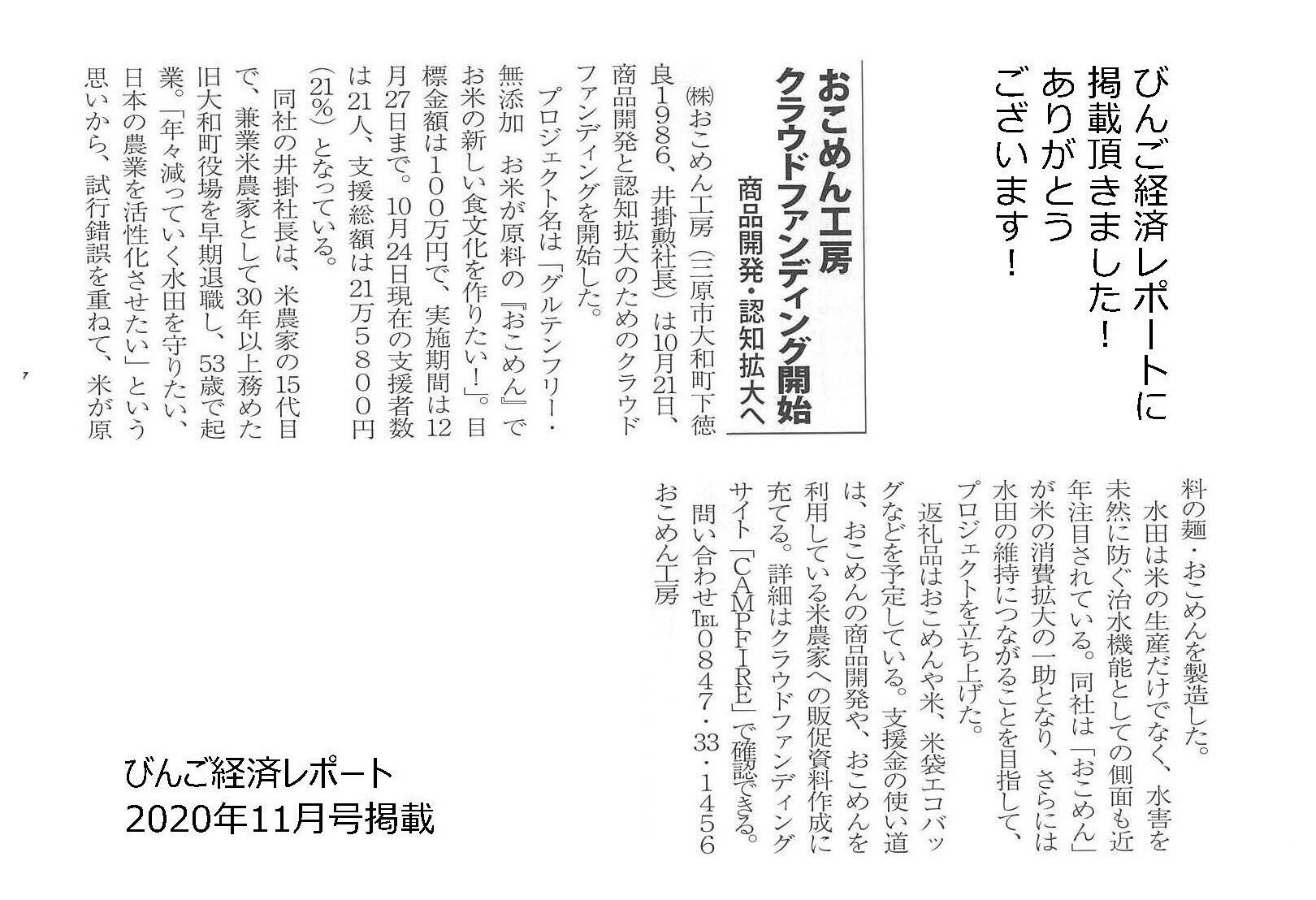 こんにちは!おこめん工房の井掛です!ご支援ご協力いただいております、皆さまありがとうございます! びんご経済レポート11号に掲載して頂きました!!今回のクラウドファンディングの目的や弊社の想いもしっかりと掲載して頂き、ともて嬉しいです。記者さん、ありがとうございます。引き続き応援宜しくお願い申し上げます。