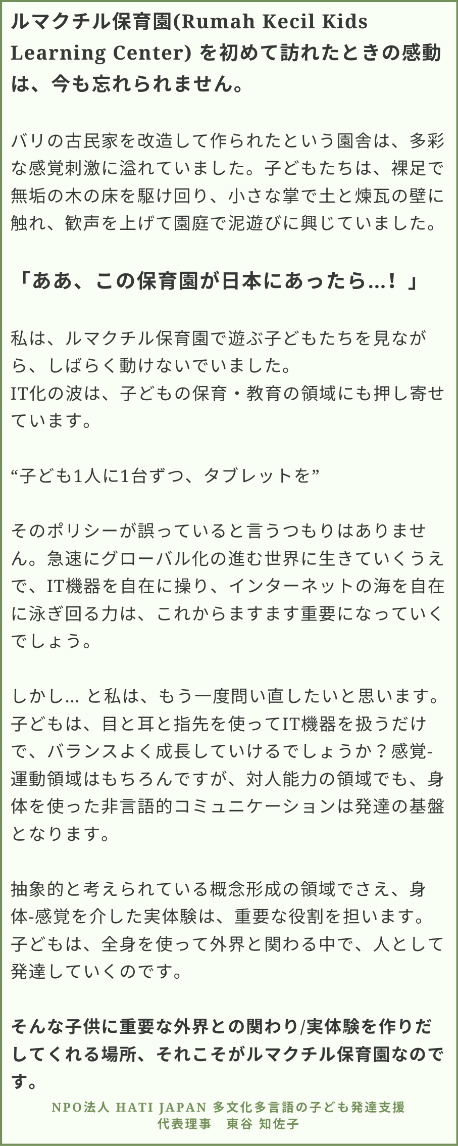 私はバリ島のサヌール地区で「遊びが学びになるように、学びが遊びになるような」保育園【RUMAH KECIL(ルマクチル)】を2014年から経営しています。