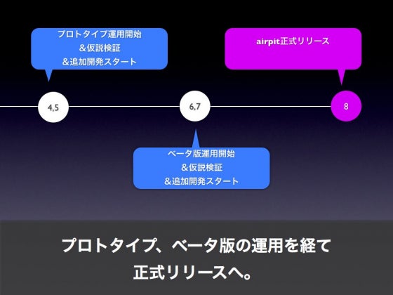 その後はU2plusのリソースを使って ・プロトタイプの運用からわかったことを改善して、ベータ版の開発、運用を行います。 ・さらにベータ版の運用からわかったことを改善して、正式リリースに向けて開発を進めていきます。 ・airpitの正式なリリースは8月を予定しています。 みなさんに支援していただきたいのは「プロトタイプの開発まで」。そのあとはU2plusが継続して開発を進めていきます。