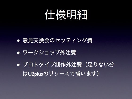 2012/07/17 14:42今回支援していただくお金は、以下の目的で使用させていただきます。 ・意見交換会などの費用(必要に応じて医療面の専門家を呼ぶ可能性も) ・専門家によるワークショップの外注費 ・プロトタイプ制作の外注費 ・ロゴなど制作費用(スライドにはありませんが・・・) プロトタイプ制作の時点でマイナスの可能性もありますが、その際はU2plus社内のリソースを用います。 もっと見る