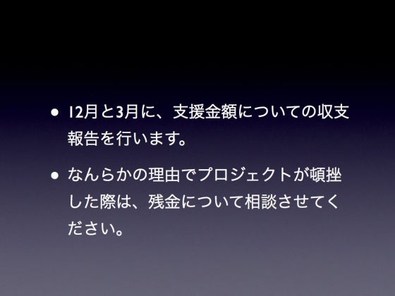 2012/07/17 14:4412月と3月に、パトロンのみなさまへ、収支報告を行います。 また、なんらかの理由でairpitプロジェクトが頓挫、あるいは延期になった際にはその時点で残っているお金について、別途相談させてください。 もっと見る