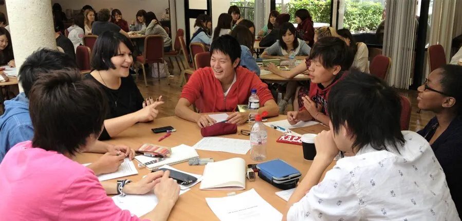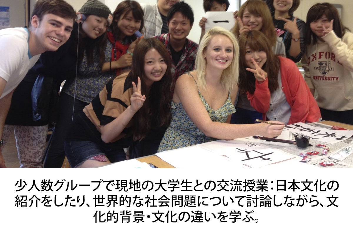 - >> 少人数グループで現地の大学生との交流授業:日本文化の紹介をしたり、世界的な社会問題について討論しながら、文化的背景・文化の違いを学ぶ。色々な意見を聞き、友達もできます。