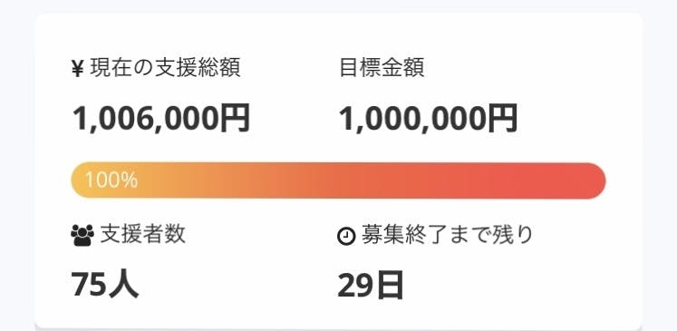 はじめの目標金額の100万円も集まるか不安でしたが、6日目での達成に驚きと感謝の気持ちでいっぱいです。