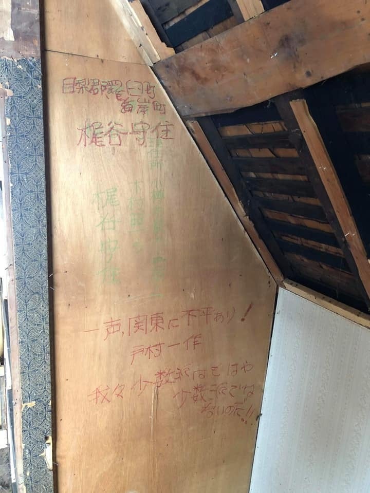 HALLの壁・床を貼る前に自分の名前を書く!古民家の2階を解体したところ、昔の方が書いたサインがたくさん出てきました。これを僕らもやろうかと。名前は野瀬が書いてそちらへ写メを撮り送らせていただきます。