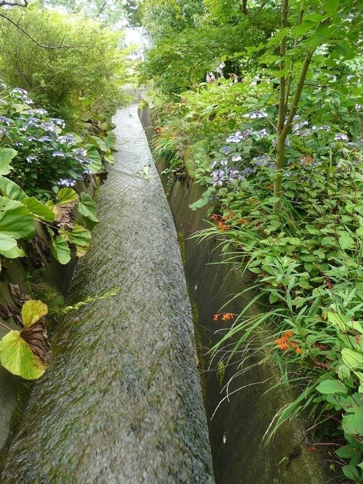 この建物の前には小さな川が流れていて、向こうに神社があります。