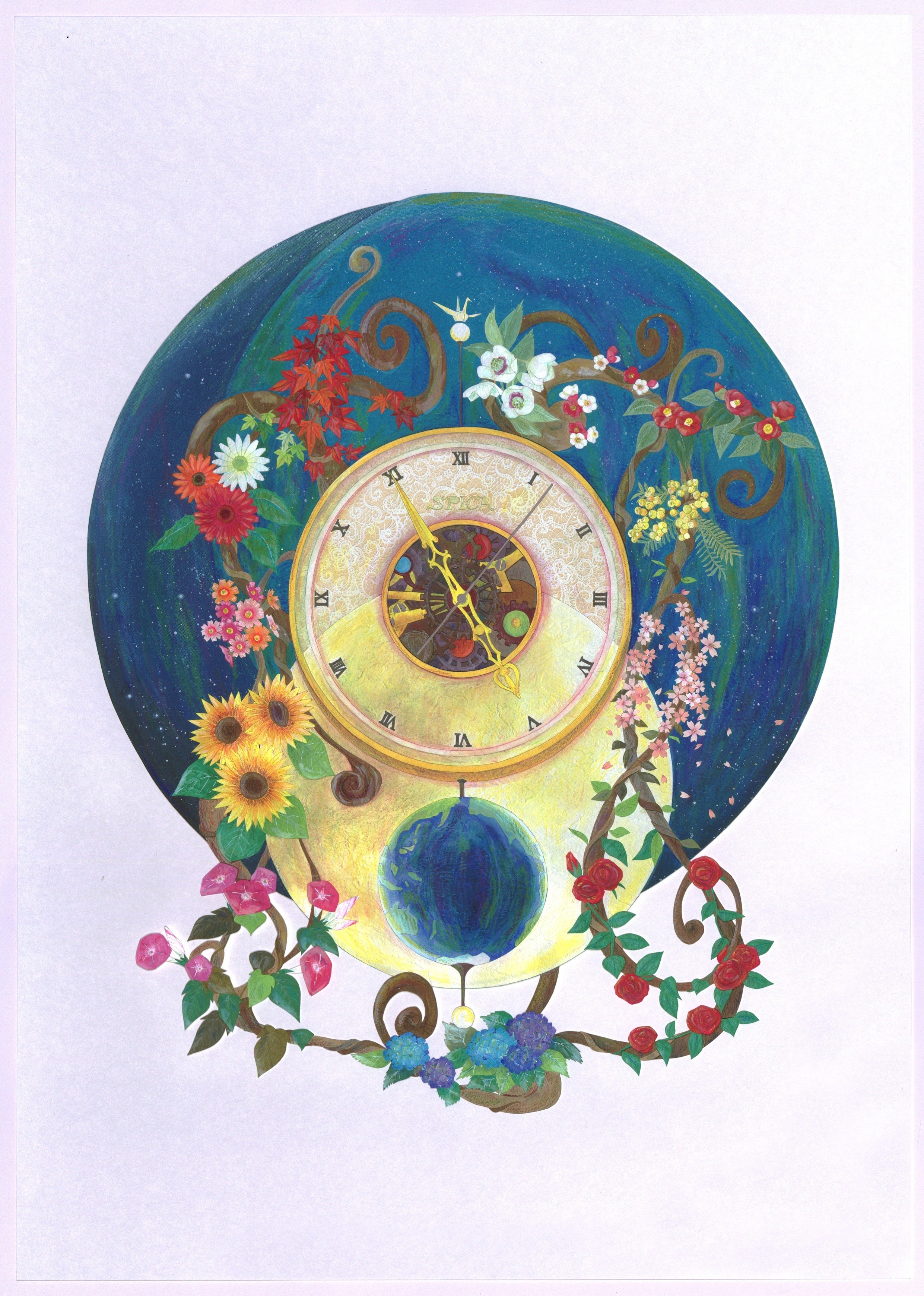 12か月の花が咲き乱れ、12を差すてっぺんには真っ白な折り鶴が。