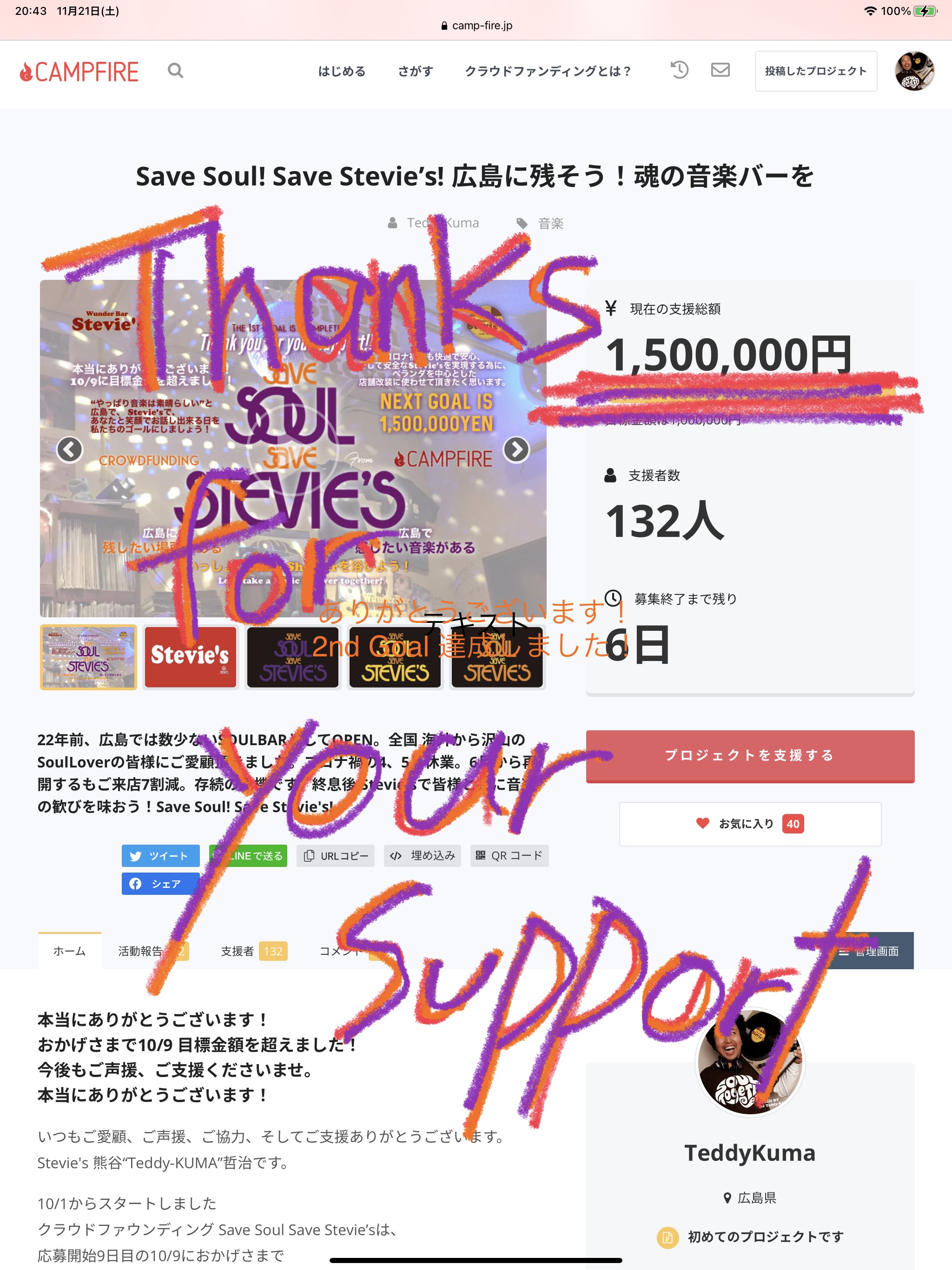 思いもよらない150%ものご支援を頂きました。