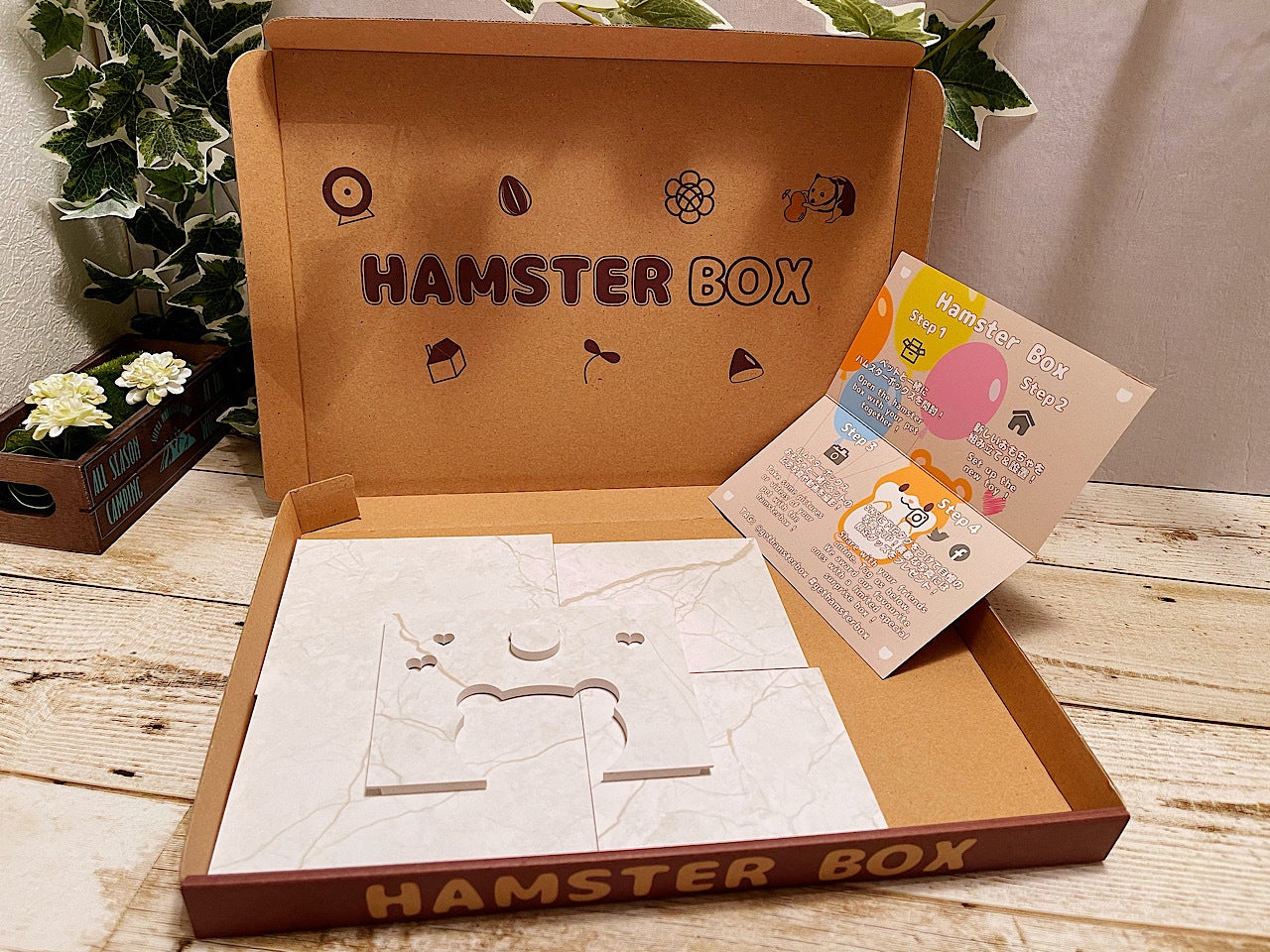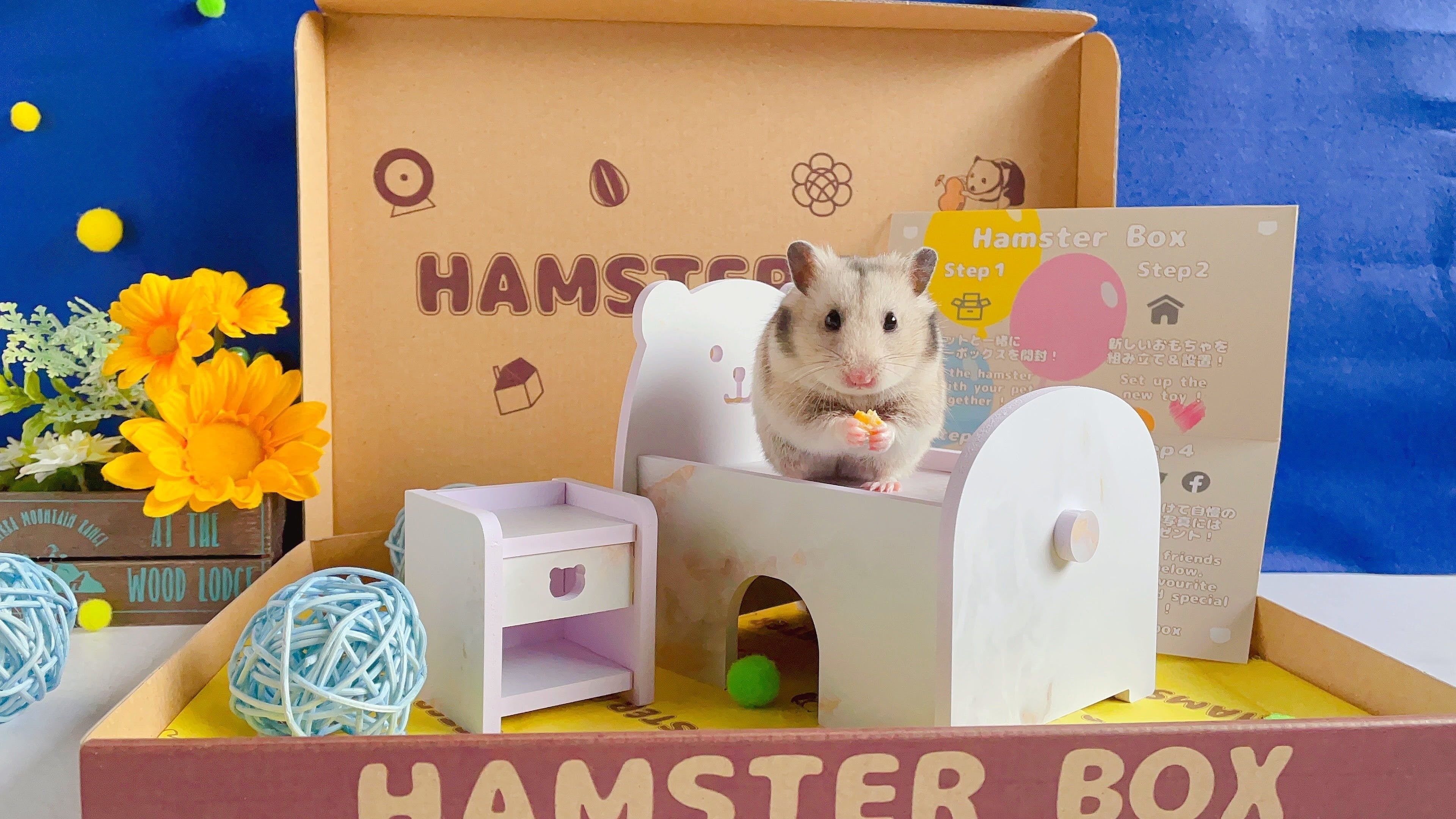 HAMSTER BOXは可愛い装飾のついた専用のBOXに入れてお届けします。自慢のペットちゃんと一緒に撮影して是非SNSにアップして下さい!