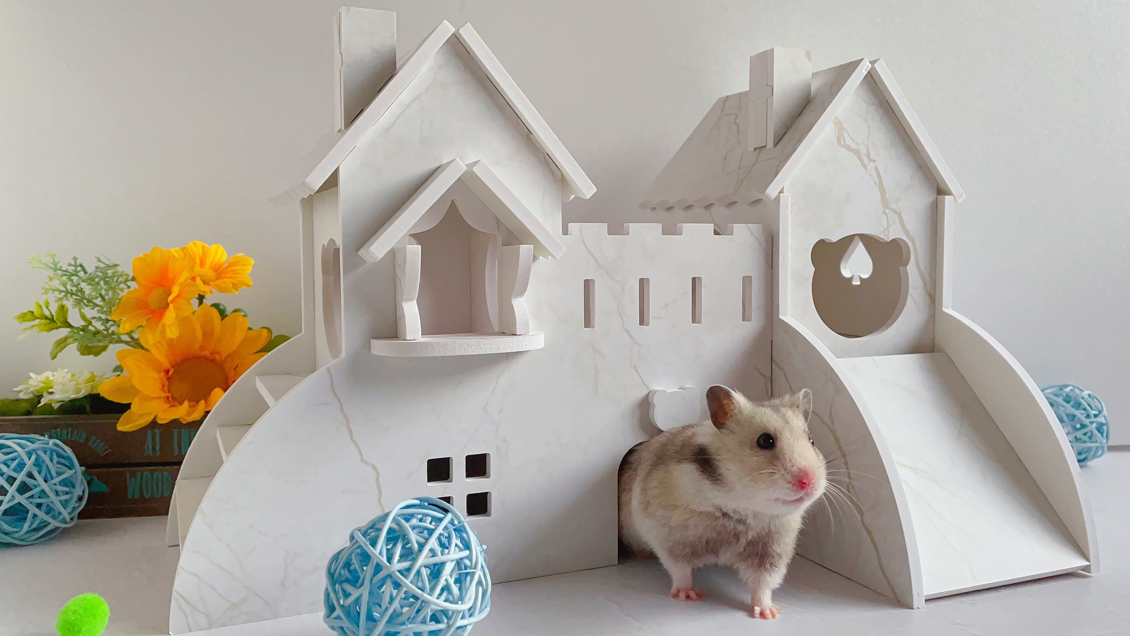 ハリネズミを象ったロゴがキュートな2階建てハウスです。段差の昇り降りがあまり得意でないハリネズミちゃんのために、2階への階段はスロープ型になっています。