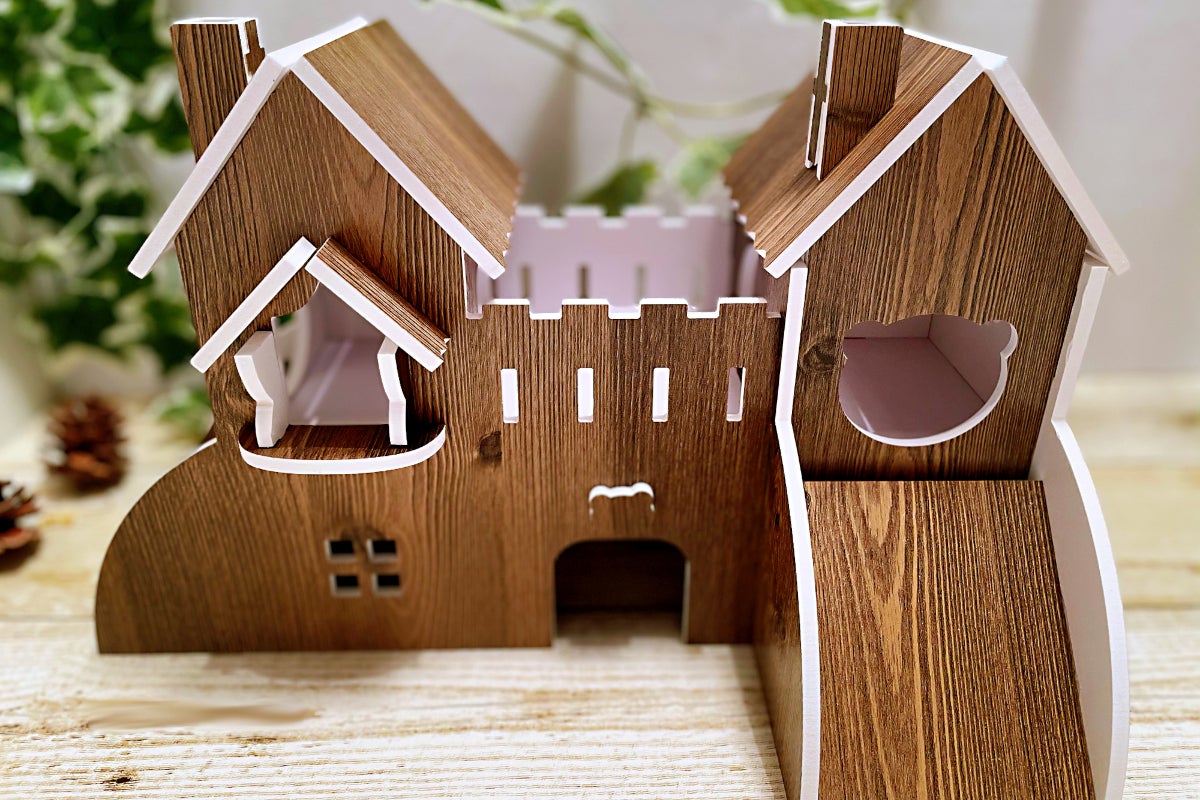 シックな色合いと可愛らしい造形が融合したお城型ハウスです。1F部分は落ち着いて過ごせる居住スペースで2F部分は滑り台や撮影スポットの渡り廊下といった遊び心溢れる空間になっています。