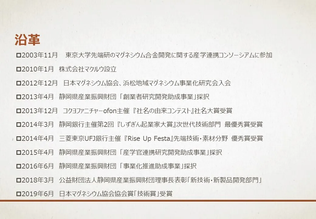 そこで、マグネシウム商品の市場拡大、並行して生産能力の拡大に向けた投資や研究開発、さらに「マグネシウム=マクルウ」というブランド化を目指し、MIRUIプロジェクトへ挑戦することといたしました。