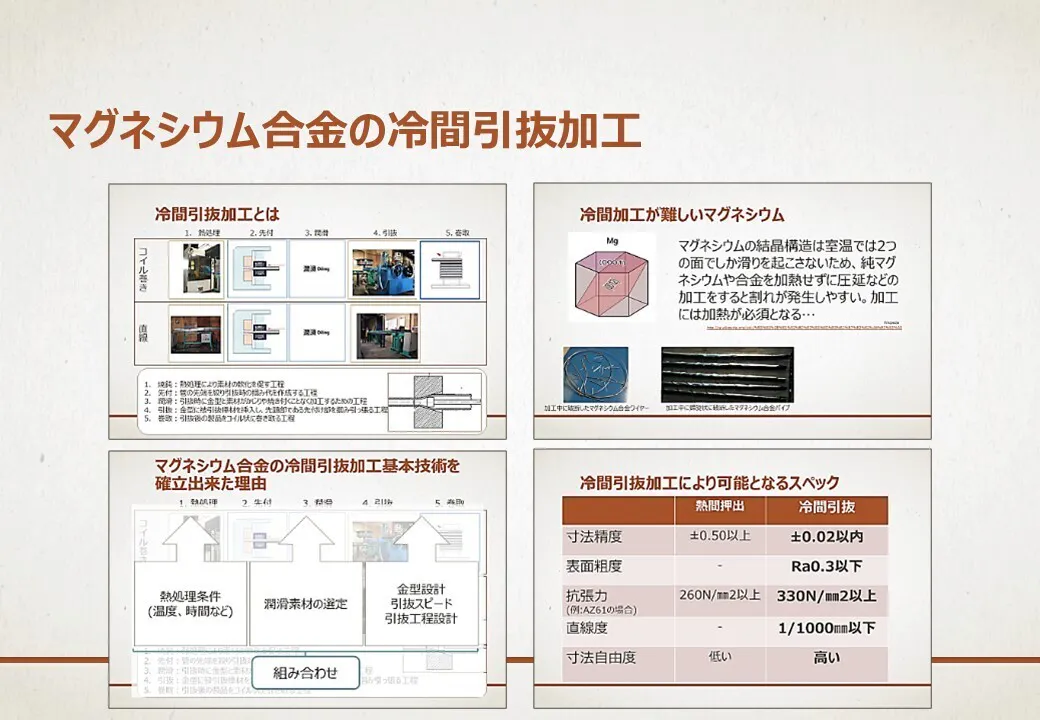 一方、他の金属では一般的であるパイプ材や板材などを変形させる加工(塑性加工)や溶接が難しく、マグネシウムの活用範囲は限られてきました。