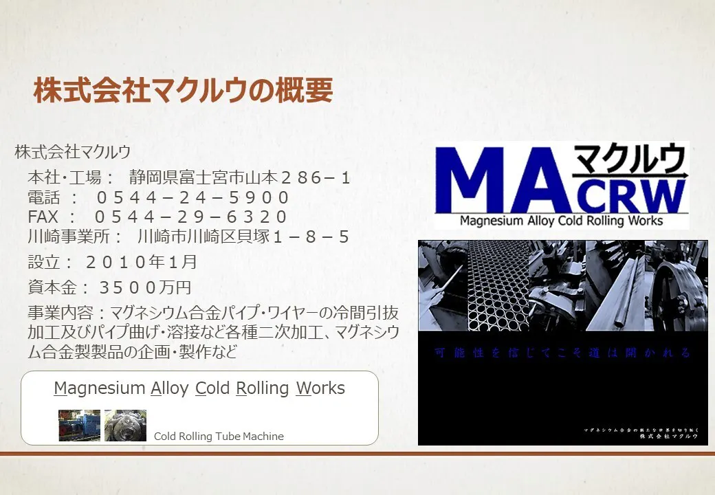 株式会社マクルウは、富士宮市の南部で富士市との市境、星陵中学校・高校と岩本山公園の間にある築50年の小さな工場で、マグネシウムの加工に特化したモノづくりベンチャーとして活動しています。