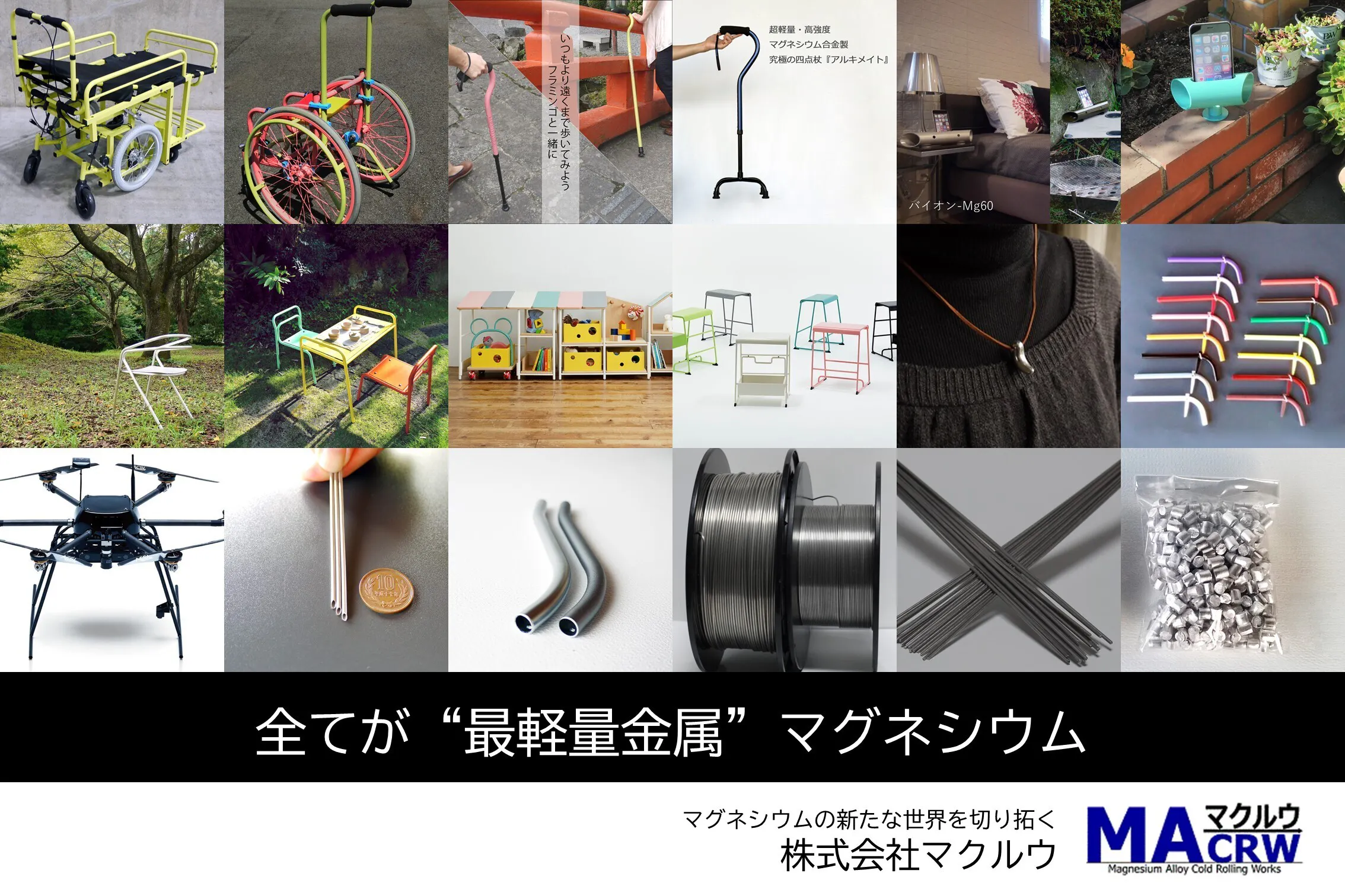 軽くて強いというマグネシウムの特性を活かし、杖や車いすといった福祉介護機器、イスやスツールなどのインテリア、ロボットやドローン用パーツ、さらにはマグネシウムの音響特性を活かした音響部品など様々な展開を進めています。
