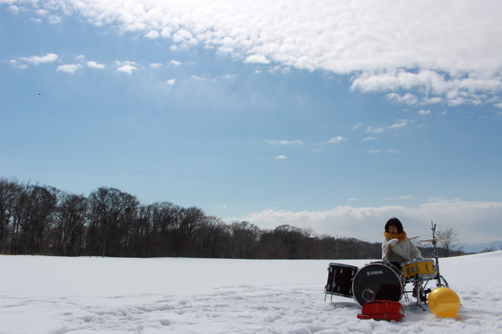 小学校のグラウンドにドラムセットを運んでのMV撮影二日目。この日は晴天に恵まれました。