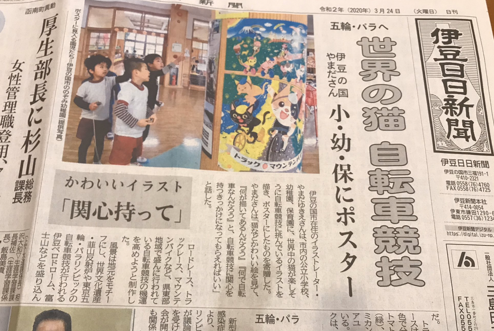 猫や犬が自転車競技をしているポスターを自費で作成し、地域の学校、施設に張り出していただき、