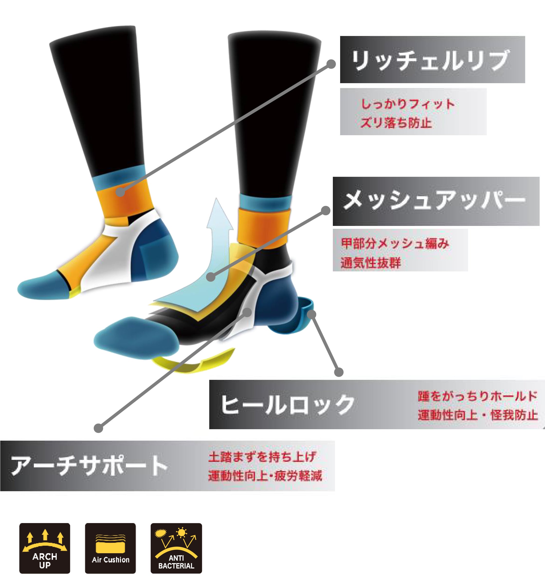 真面目に開発した渾身のアゲアゲの疲労軽減快適サポート機能が【ノンストップ・ソックス】には標準装備されています!