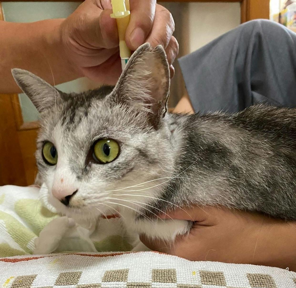 家族みんなでお薬投与です。はじめは戸惑いの連続でしたが、今では投与も慣れています。うずらも大人しくじっとしていてくれます。
