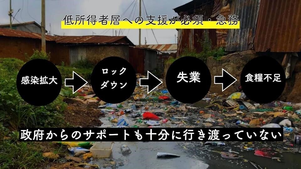 ケニアでは3月、自粛要請が発表され、4月上旬にはナイロビ首都圏全体で都市封鎖(ロックダウン)が実施されました。これにより高所得者層は家に閉じこもると同時に、家や地域への人の出入りを制限するため雇っていた人たちを解雇していきました。その結果、70%以上のスラム住民が仕事を失ったといわれています。