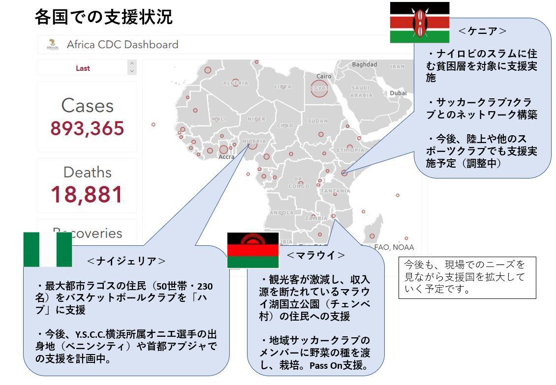 ブを選定しています。約2か月半で個人・企業・Jリーグクラブなど250名を超える方から寄付をいただき、ケニア・ナイジェリア・マラウイで合計9クラブを通して600世帯(3000名)以上に食糧や衛生用品を配布することができました。