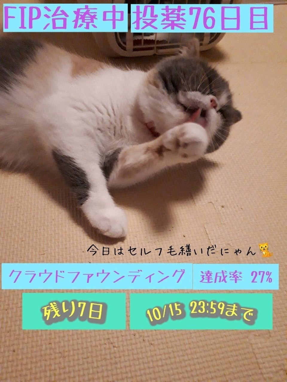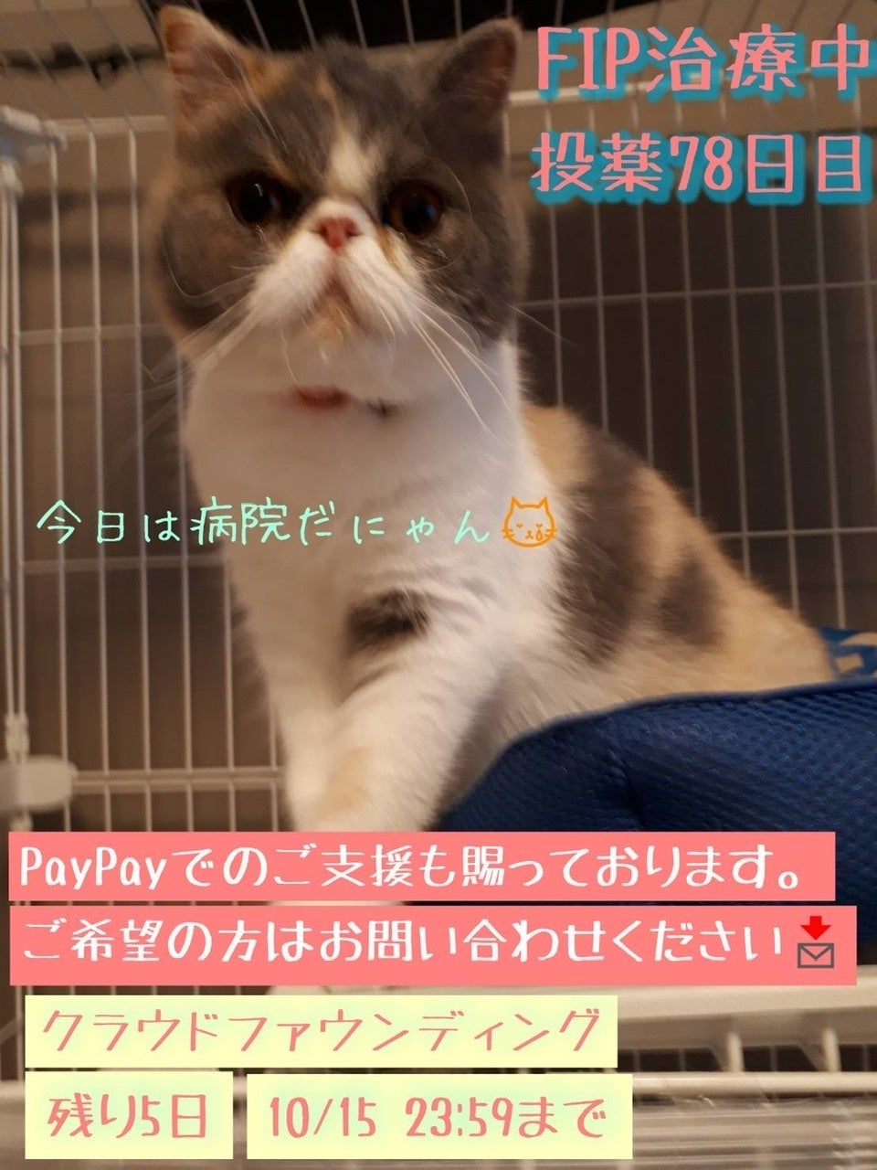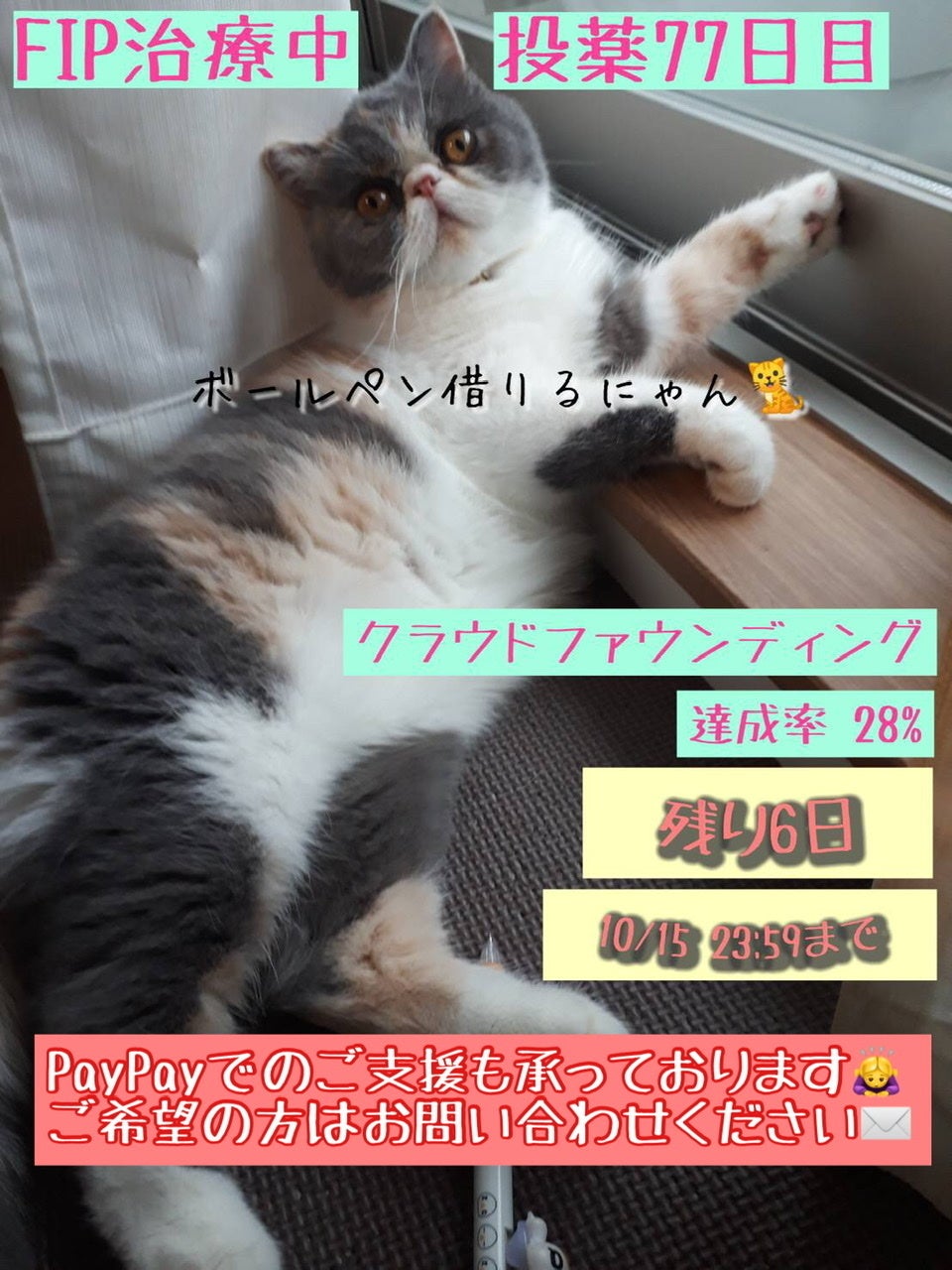 おはようございます。投稿遅くなりまして申し訳ございません。◇◇◇◇◇◇◇◇◇◇◇◇◇◇投薬79日目体重 3580g内服 450mg食事 やや減退排便 あり◇◇◇◇◇◇◇◇◇◇◇◇◇◇皆様はとくに台風の被害はございませんか???正直、台風で病院行けるかなって心配もありましたが、無事に行くことができて良かったです。台風をはじめ、災害の可能性を考えるとFIPや他の病気で通院されている猫ちゃんは大変ですよね。それでも命には代えられません。さて、今日のキャリコはアンパーンチならぬ猫パーンチです。ちょうど良くカメラを構えたらバッチリなタイミングです。パンチができるぐらい、元気になったんだね。頑張ったね。それでは、本日もよろしくお願いいたします。