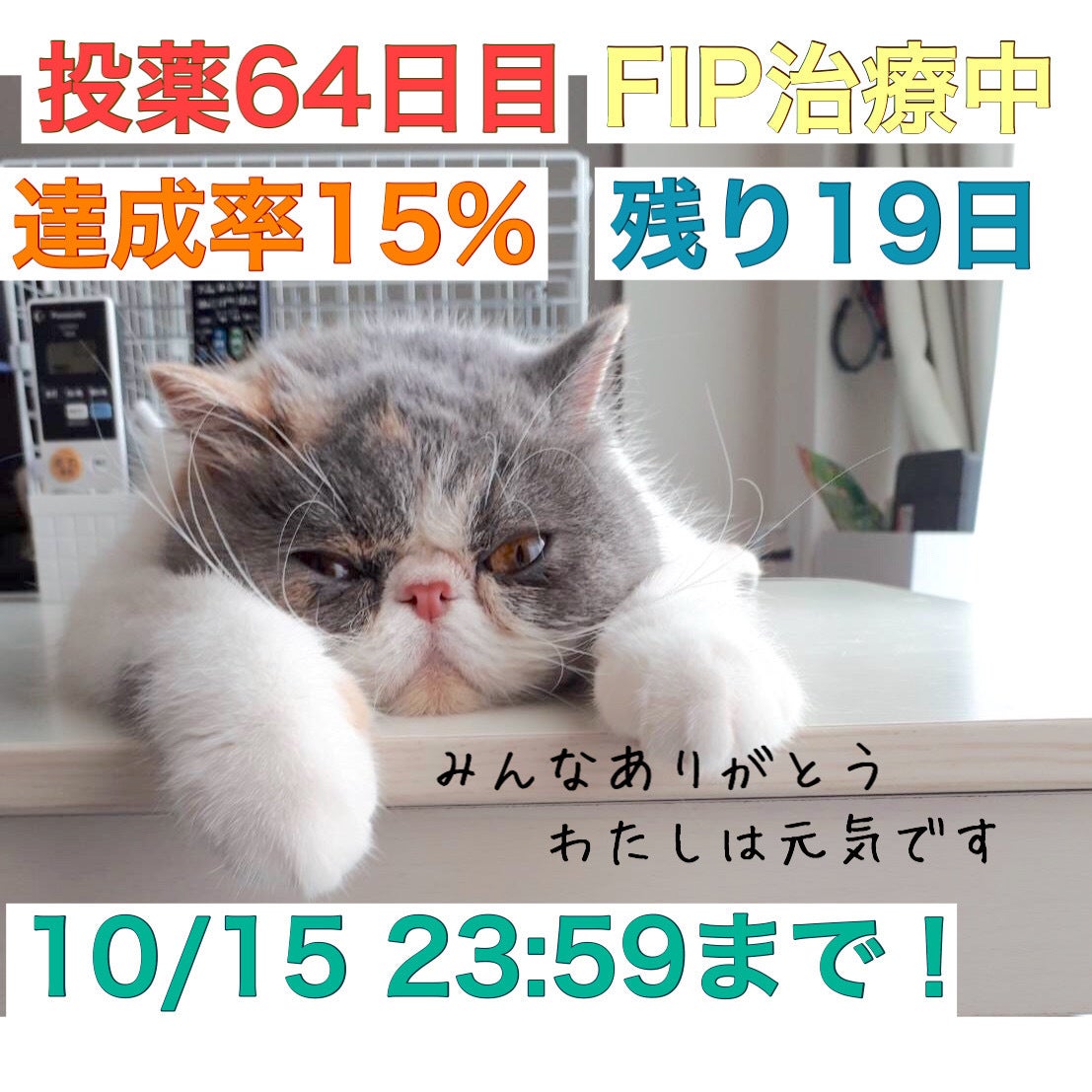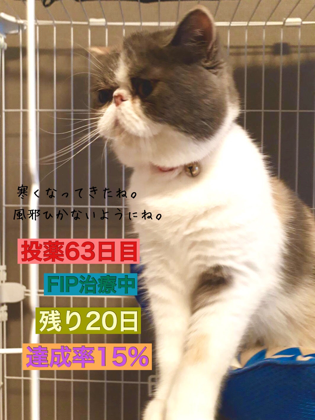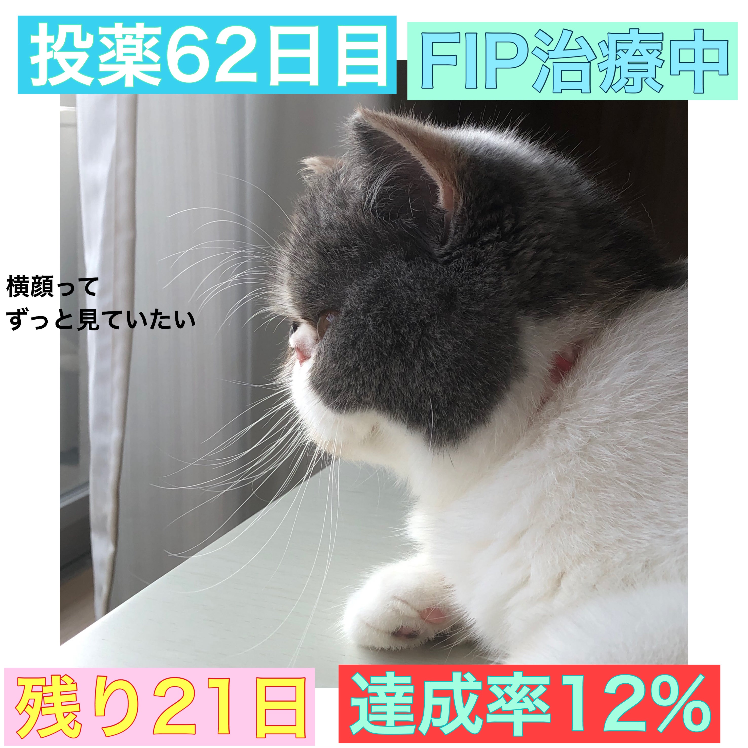 おはようございます。昨日は10名の方々から、20,000円のご支援を頂きました。誠にありがとうございました。キャリコのFIP治療のために大切に使わせていただきます。◇◇◇◇◇◇◇◇◇◇◇◇◇◇投薬65日目体重3545g内服450mg食事 摂取やや減退排便 あり◇◇◇◇◇◇◇◇◇◇◇◇◇◇食欲は時折ムラがあります。治療前は本当に食が少し細くなり、今思えばなんで異変に気付かなかったのかと後悔してします。キャリコ、本当にごめんね。今でも食事が進まないと不安になることもありますが、連日を通して彼女の様子を観察していきたいと思います。さて、今日の写真はパパに捕獲されたキャリコです!元気になってきた証拠ではありますが、彼女は家の中を駆け回り、ソファやキッチンでいたずらをしています。そんな彼女をパパが捕まえて叱るかと思いきや、女の子には超ーーー甘いのです!「こらー!だめだニャー!!キャリちゃん、捕まえたぞー♡」と言いながら確保しております。(パパ…全然叱ってないよ…笑)身体が大きくてお鬚面の屈強な男性が、小さくて可愛らしい猫にデレデレする姿は少し笑ってしまいます。それでは、今日もよろしくお願い致します!