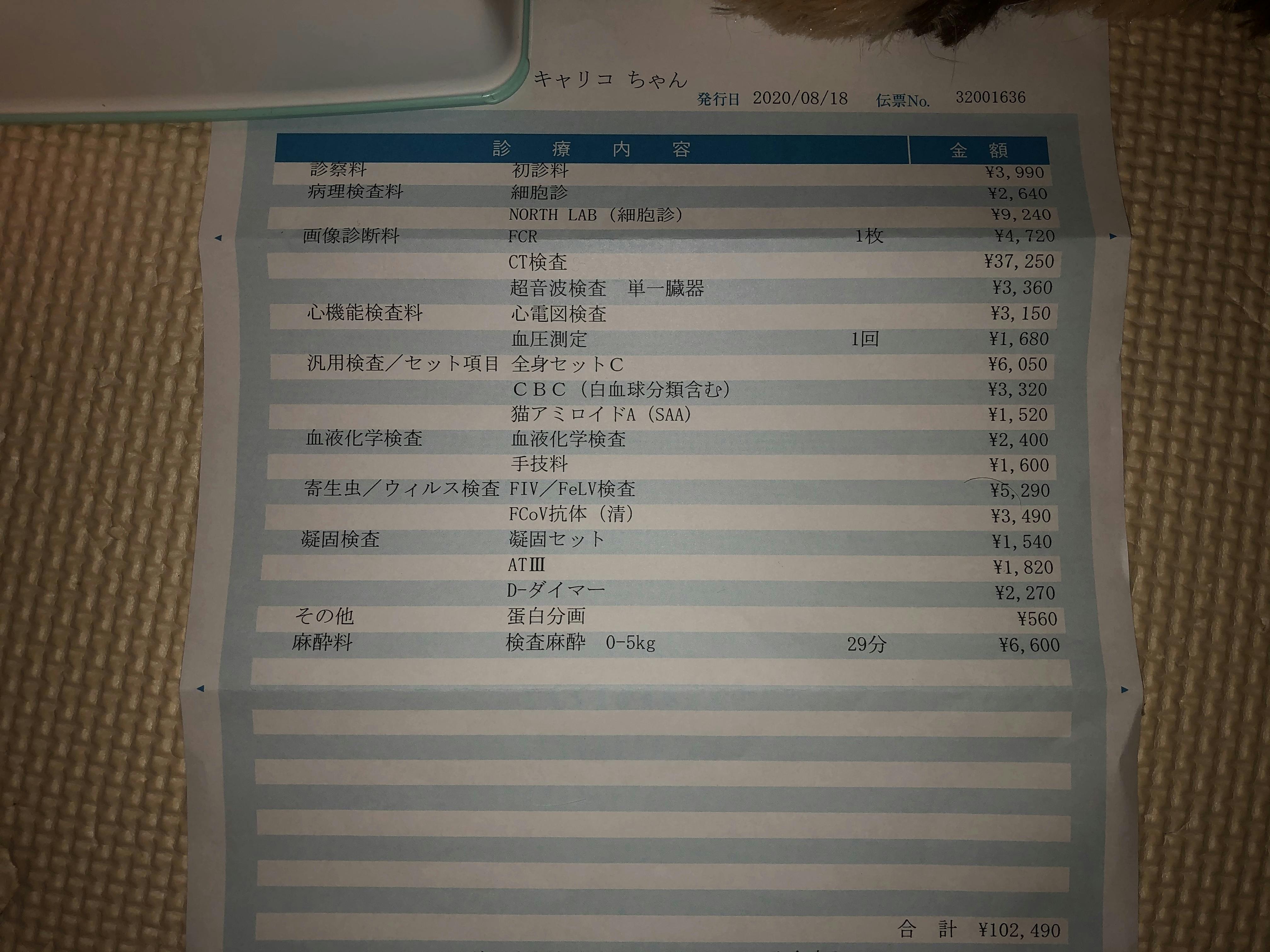 その後、リンパ管が大きくなっていることが分かったため、全身麻酔下でCTとリンパ管の生検を行いました。先生からは「FIPの場合は治療法がないため、緩和療法を行っていく」ということをお話しいただきました。