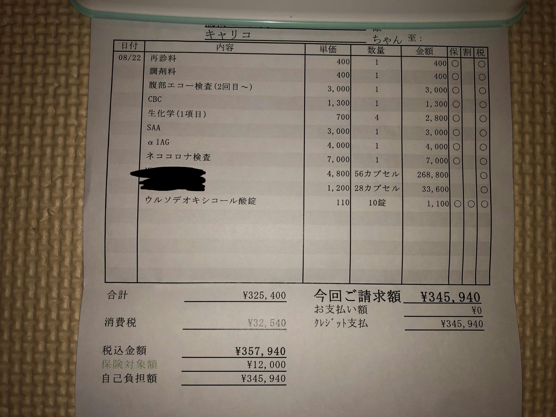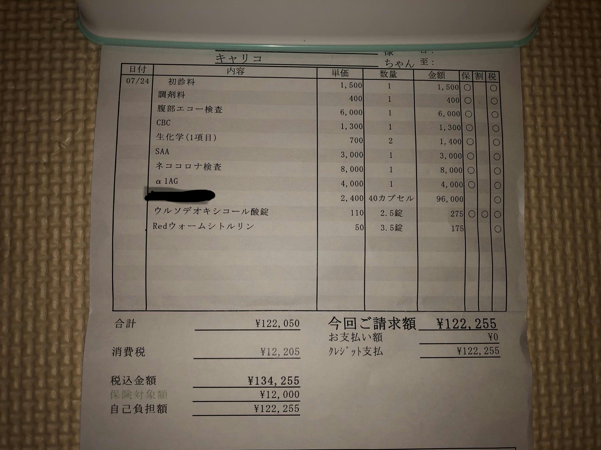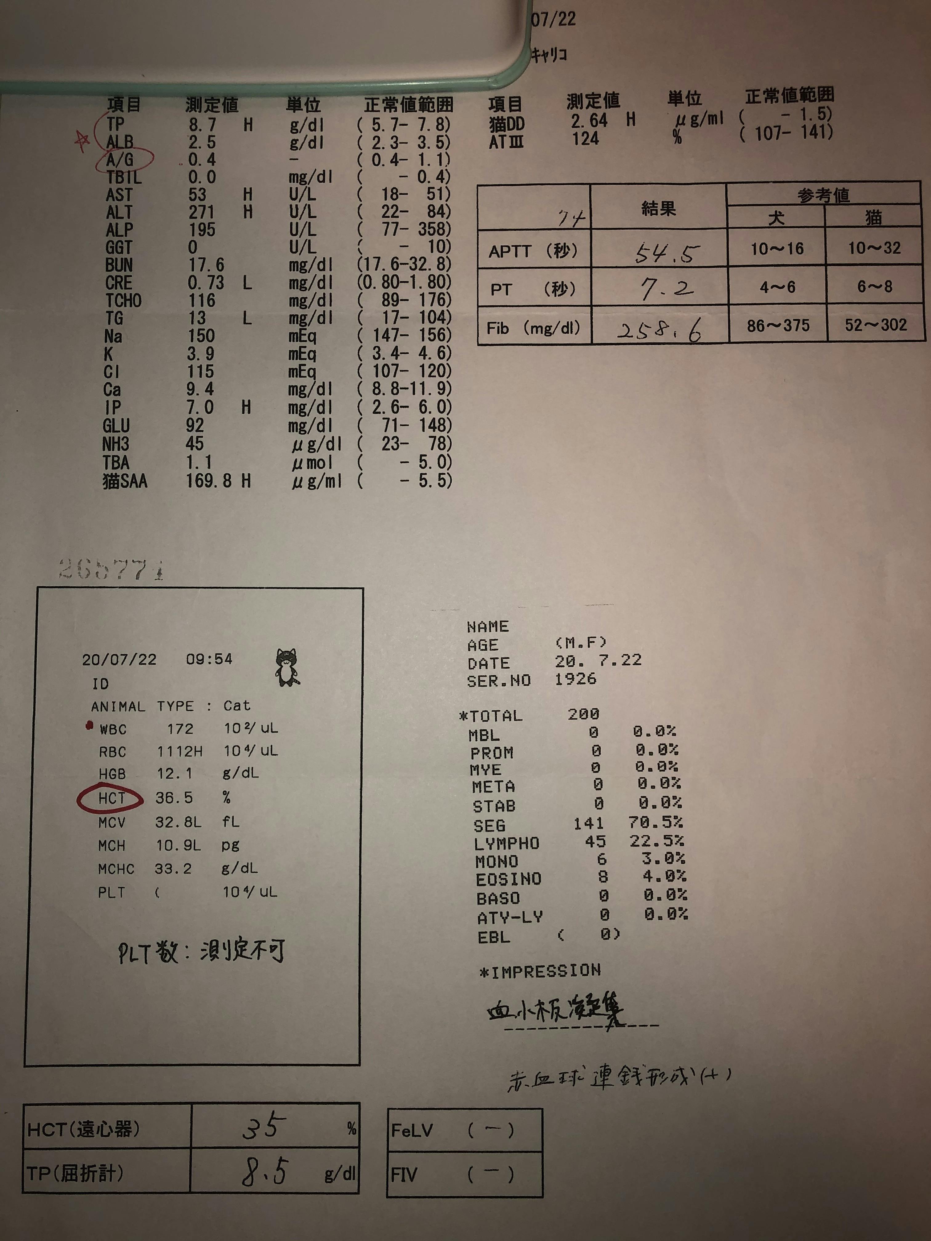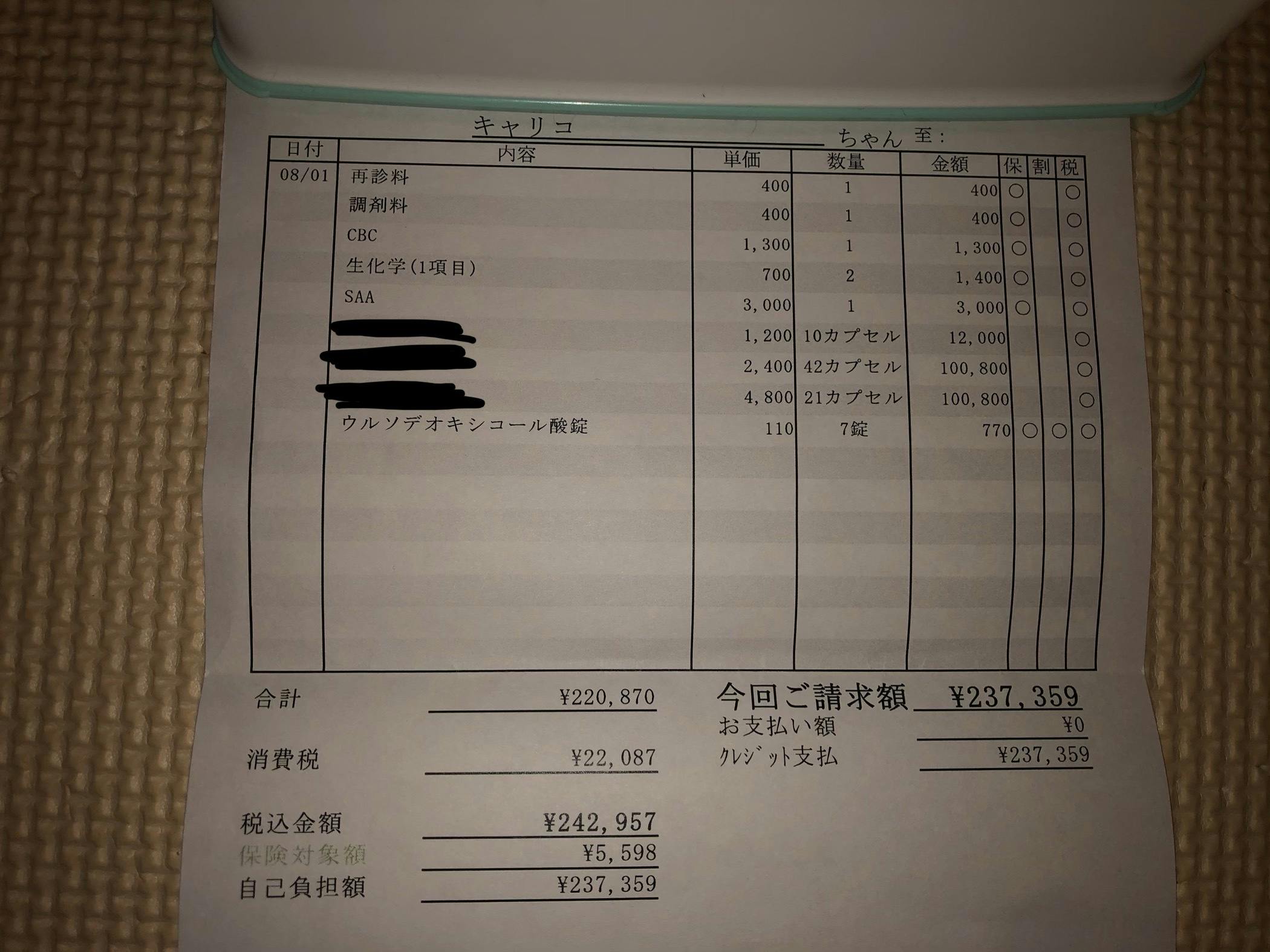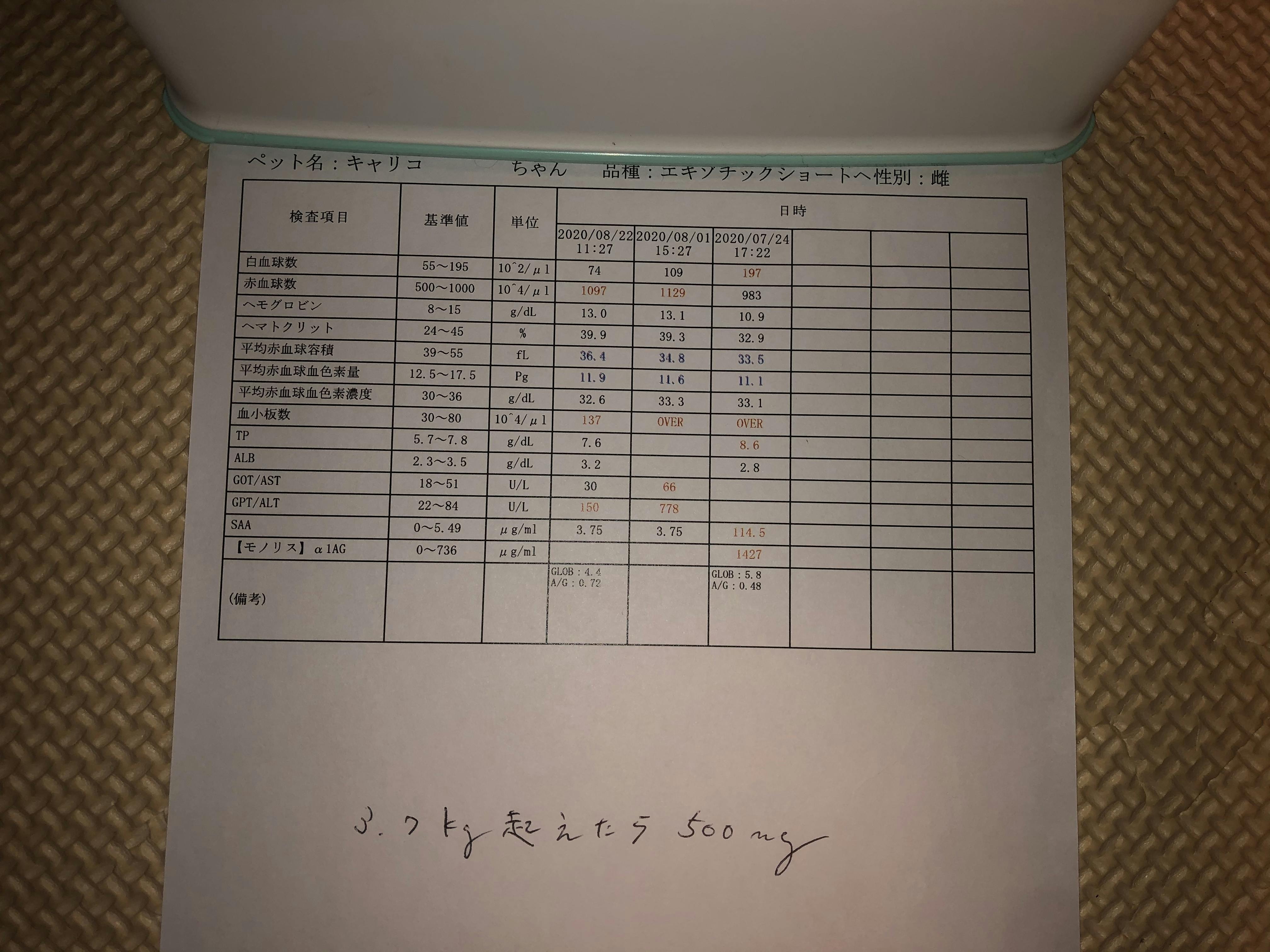 2020/7/24 協力病院へ受診。血液検査、エコーを実施。肝機能の数値が悪いためウルソデオキシコール酸も内服することに。体重3180g、国内未認証薬の内服を開始。10日分の処方を頂きました。内服の失敗時のために、余分に処方を頂いています。血液検査は下記に詳細をまとめます。