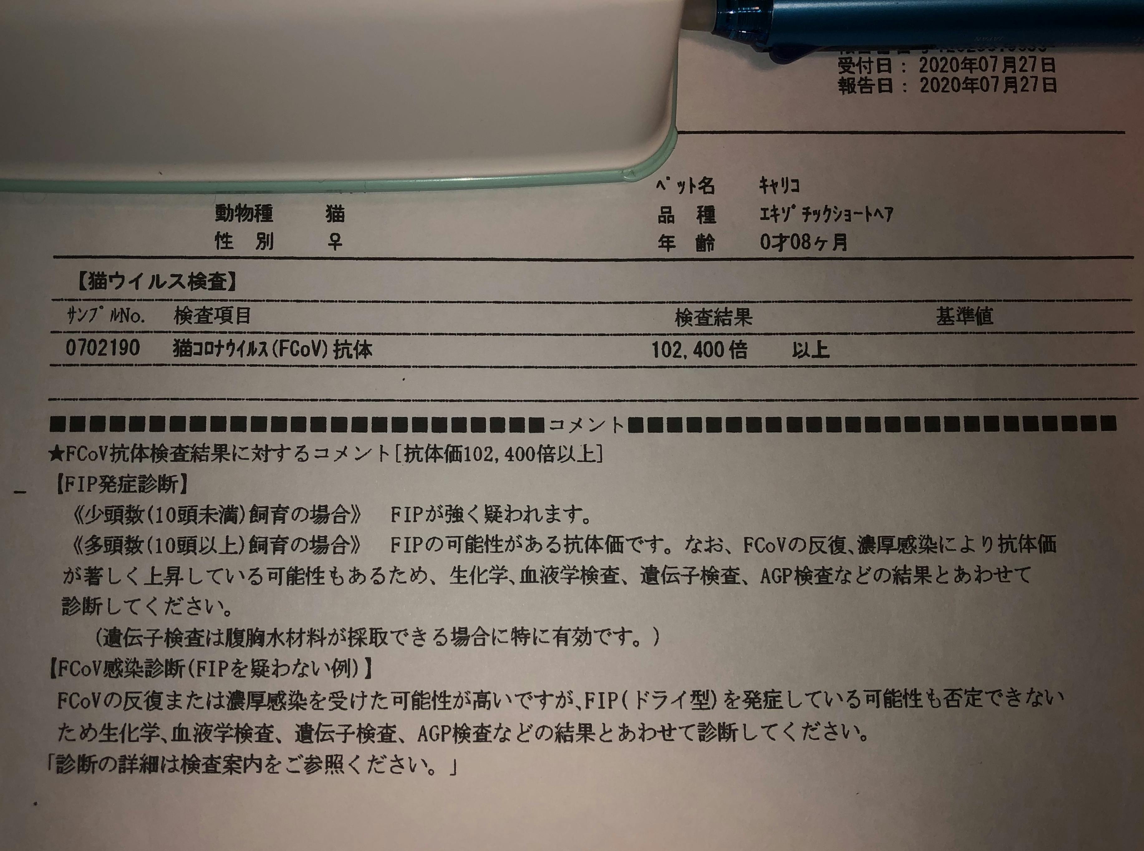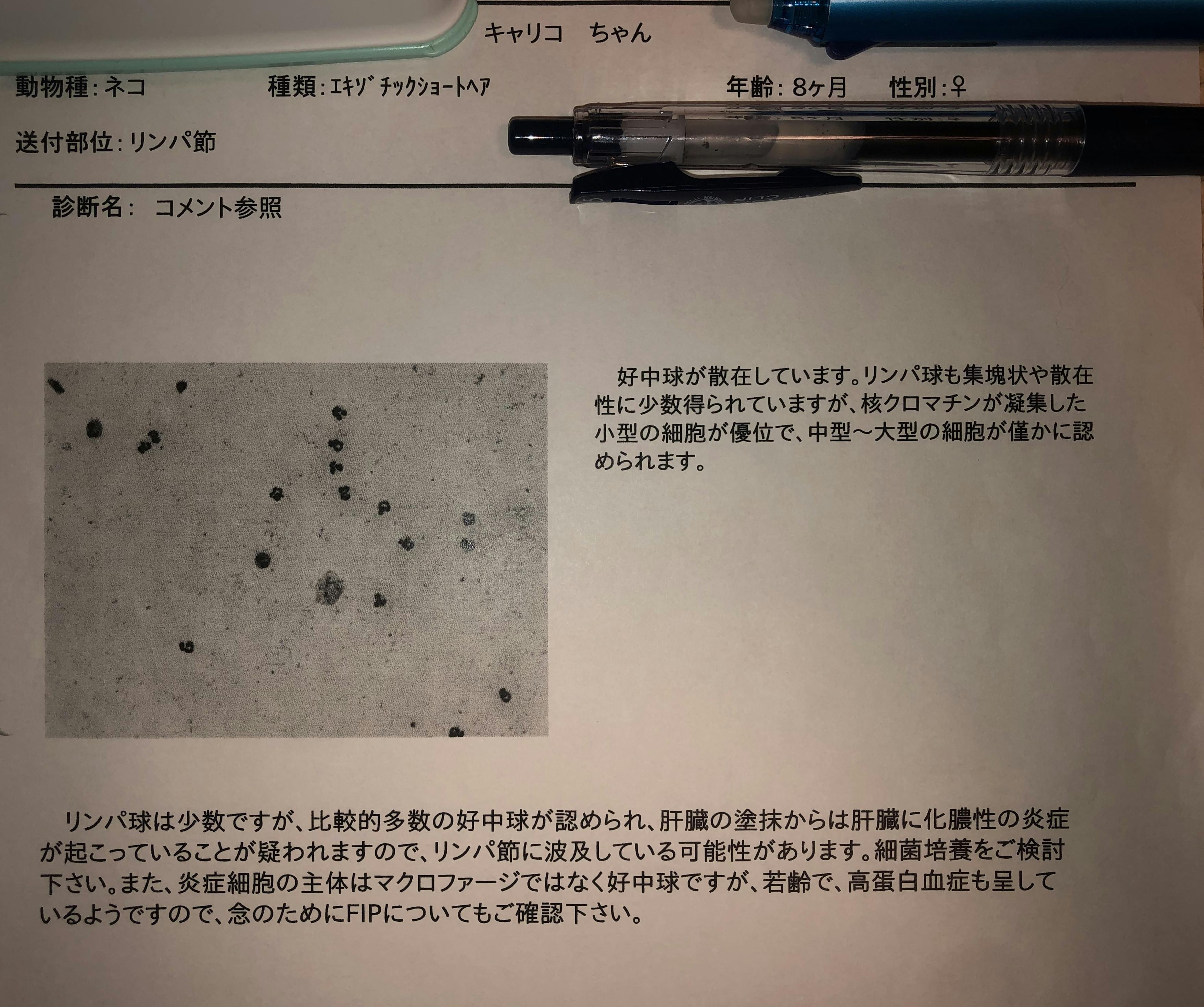 リンパ節の生検と血液内のコロナウイルス陽性の結果、FIPの可能性が濃厚です。