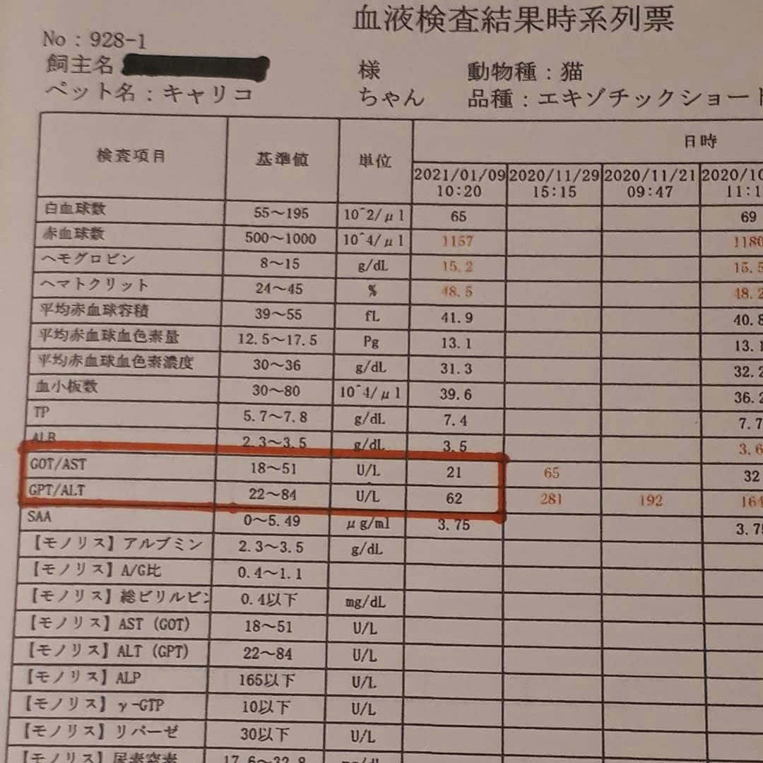 2021/01/09 21:22こんばんは(^-^)本日、経過観察終了の予定日が過ぎた為、病院へ行ってきました~本日の採血結果です。心配していた肝機能の数値ですが、薬の効果があったのかやっと正常値に戻り、薬も終了になりました~♪A/G比は0.89で問題なしです。エコーでお腹を見てもらいましたが、そちらも問題なしです。院内での検査は問題ないので、外注するα1AG(猫の炎症の数値)と血液内の猫コロナウィルスの検査の結果を受けて寛解となります☆来週末には検査結果が分かると思いますので、分かり次第ご報告しますね♪ひとまず肝臓の数値が良くなって良かったです(^o^ゞ もっと見る
