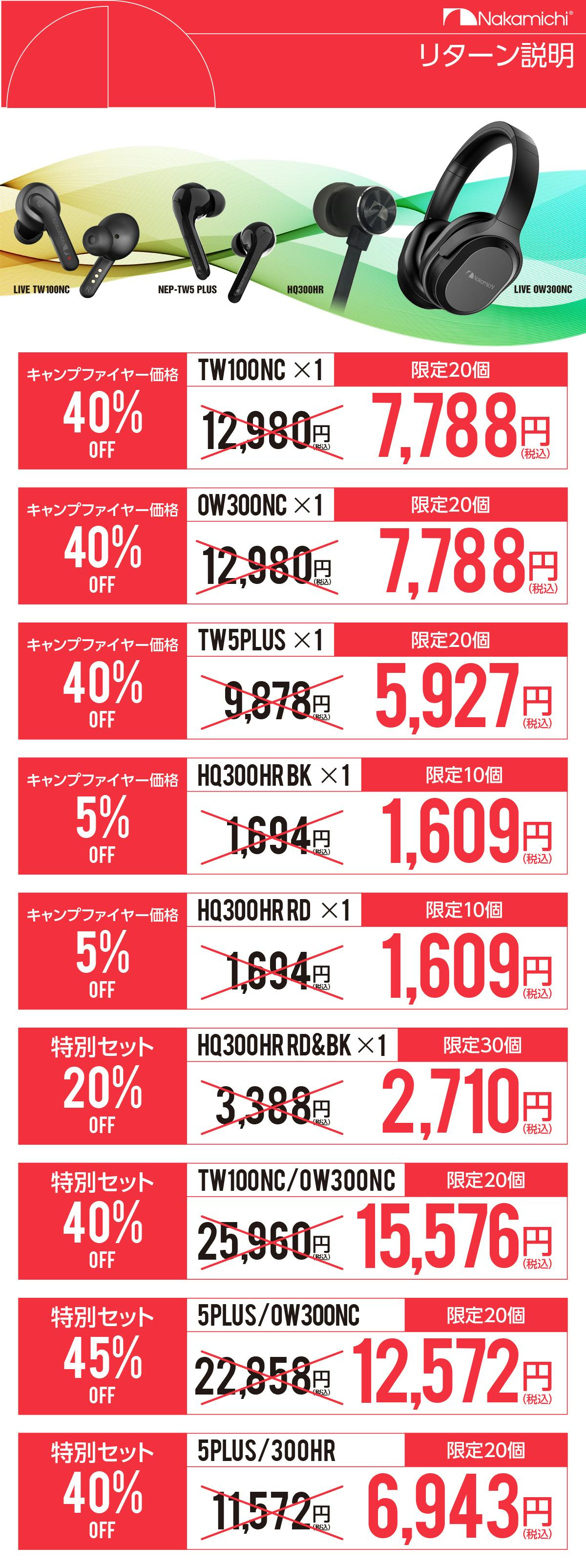 2020/12/09 17:57ご支援者の皆様お世話になります。お待たせいたしておりました、オーバーヘッドタイプのアクティブノイズキャンセルイヤホン「LIVEOW300NC」が昨日工場から出荷されております。以下のご支援を頂いた皆様には大変お待たせし申し訳ございません。12/16(水)頃には弊社より出荷ができる予定となっております。①Nakamichi完全ワイヤレスイヤホンANC対応LIVE TW300NC×1点 金額:7,788円(税込) 「一般販売予定価格12,980円(税込)の40%OFF」 ②【ANCセット】Nakamichi完全ワイヤレスイヤホンANC対応LIVE TW100NC・LIVE OW300NC 2個セット×1点金額:15,576円(税込)「一般販売予定価格25,960円(税込)の40%OFF」どうぞよろしくお願いいたします。 もっと見る入荷遅延のご連絡
