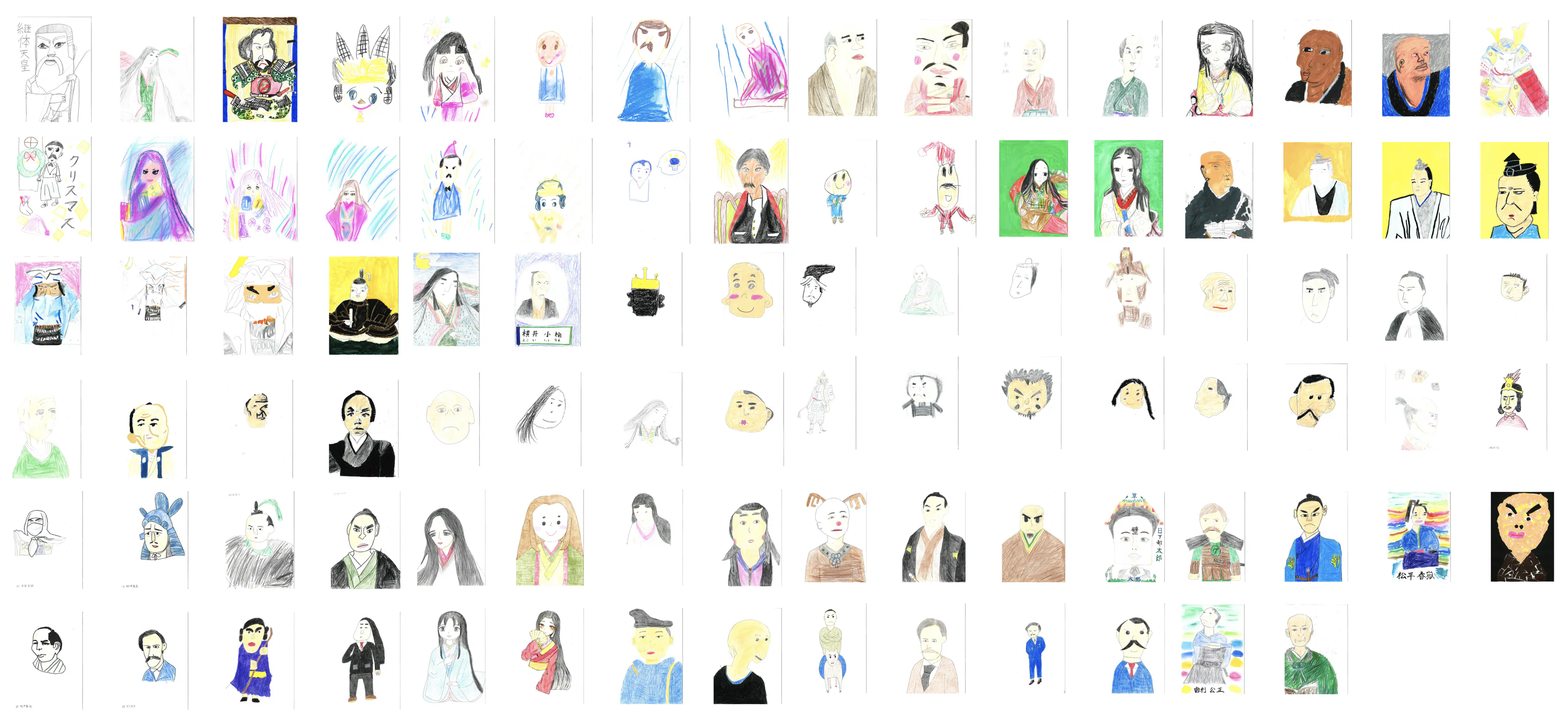 福井の偉人25人を小学生が描く似顔絵コンテストを実施しています。先週までの応募作品がこれだけ。このあとさらに勢いを増していて現場はうれしい悲鳴です。12月10日締め切り(消印有効)のあと集計してセブンシスターズが審査、25日に結果を発表します。入賞者への賞品はグリフィスのクリスマス「足袋」です!
