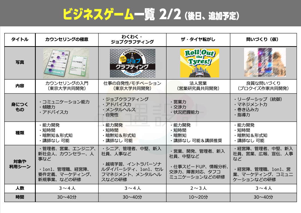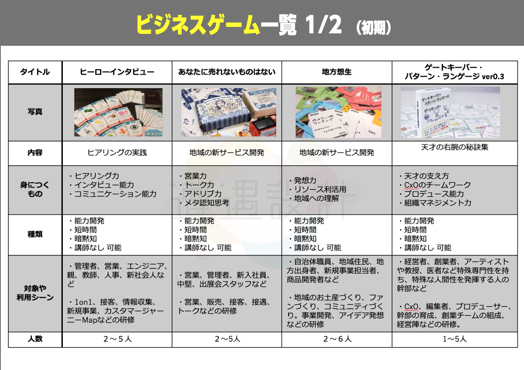 これまでに、十数個のビジネスボードゲーム開発や、多くの研修を実施してきました。
