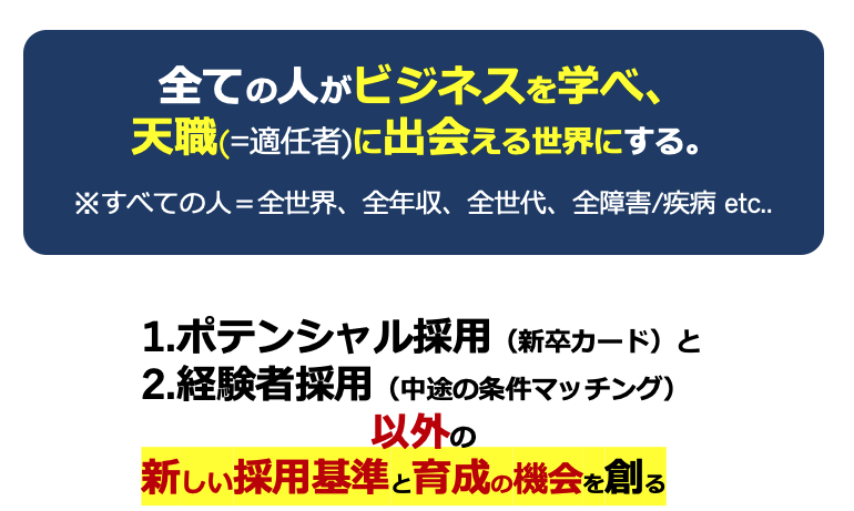 全ての人がビジネスを学べ、天職(=適任者)に出会える世界にする。