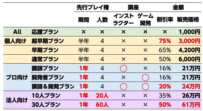 5.開発者プラン 講座11回+先行プレイ権1年分 21万円(16%OFF)