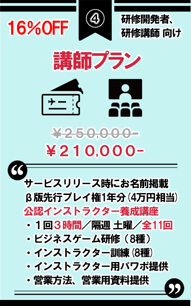 4.講師プラン 講座11回+先行プレイ権1年分 21万円(16%OFF)