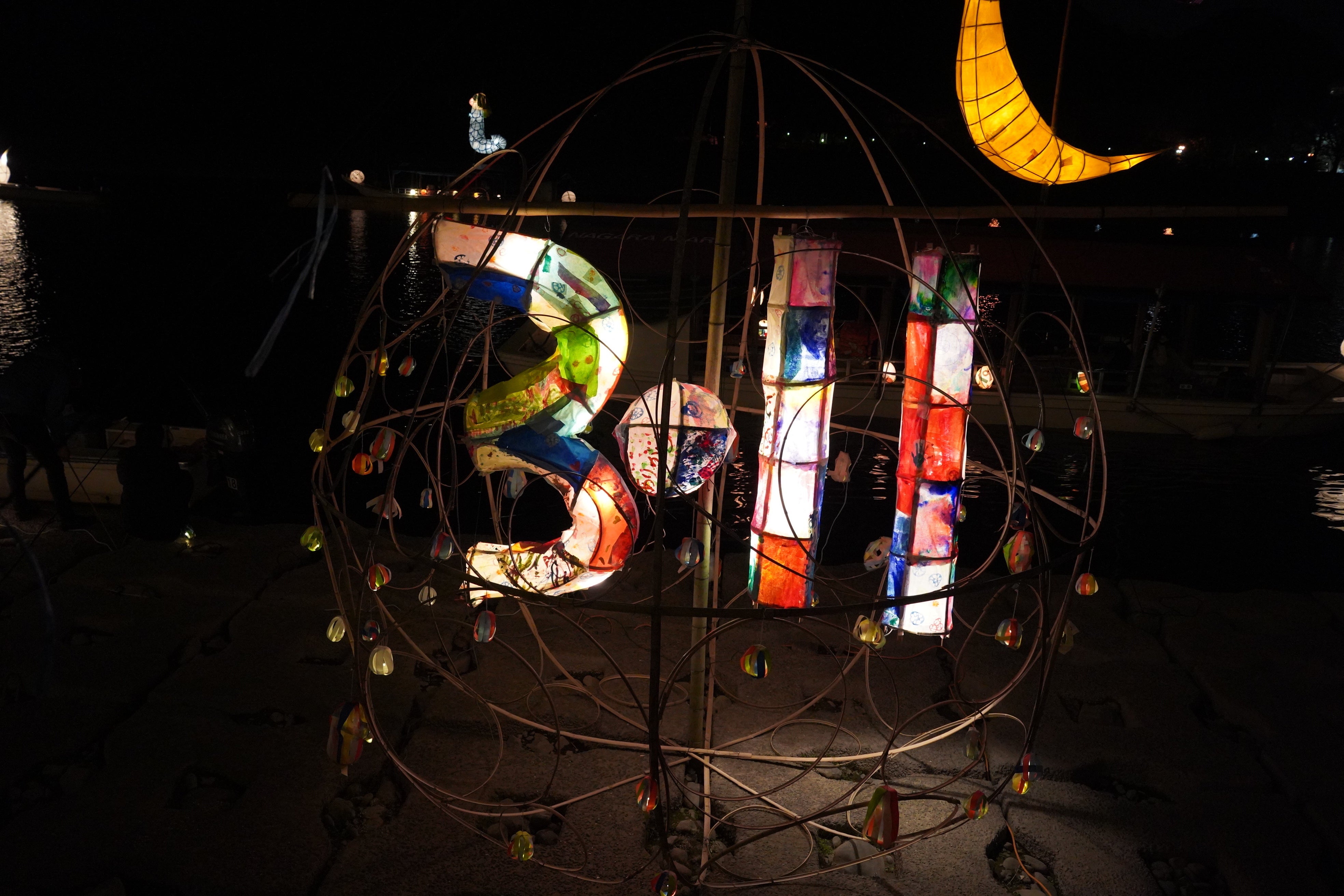 川面を流れる行灯と、風に揺れる3.11行灯