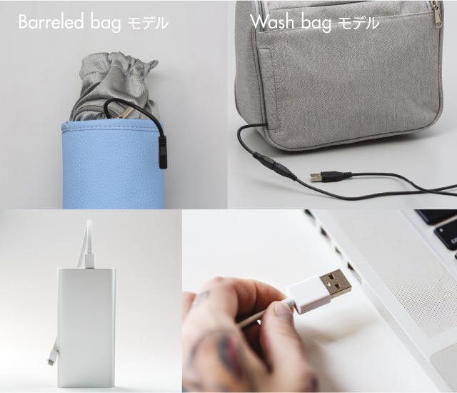 両モデルとも普段はバッグとしてご利用いただき、除菌の時は本体に収納されているUSBケーブルを取り出して電源供給して下さい。お持ちのモバイルバッテリーやUSB電源コンセント、パソコンのUSB端子などに対応しております。
