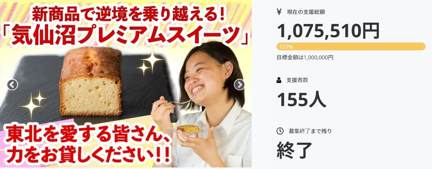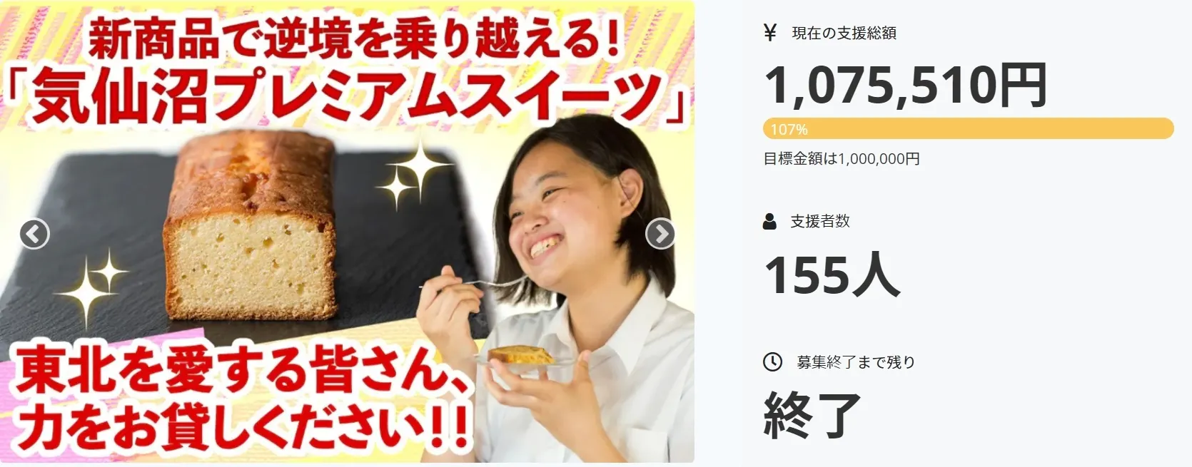 目標金額、達成されたんですね。おめでとうございます! 3.11の余震と言われる大きな地震があり、 あの時の被災者の皆さんの精神的な不安を思うと心が痛みます。 震災はまだ続いていると改めて実感しています。 私たちもこれからも応援していきます。 想いのこもったチーズケーキ、楽しみにしています。