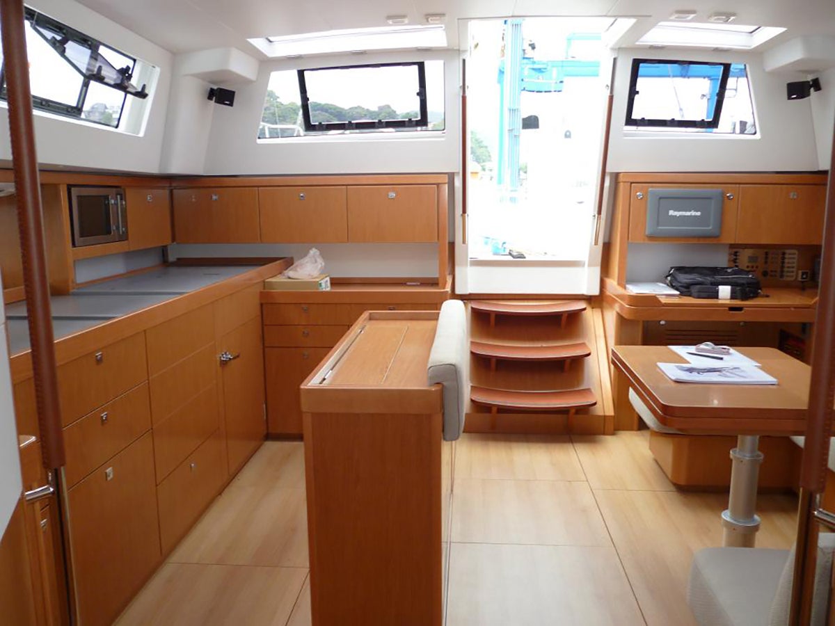 キャビン内設備2ベッドルーム(ダブルベッドサイズ)、トイレ洗面2箇所、キッチン装備(ガスレンジ3口・電子レンジ・シンク2箇所・冷蔵庫・冷蔵庫)、TV2台(ベッドルーム1台・メインリビング1台)