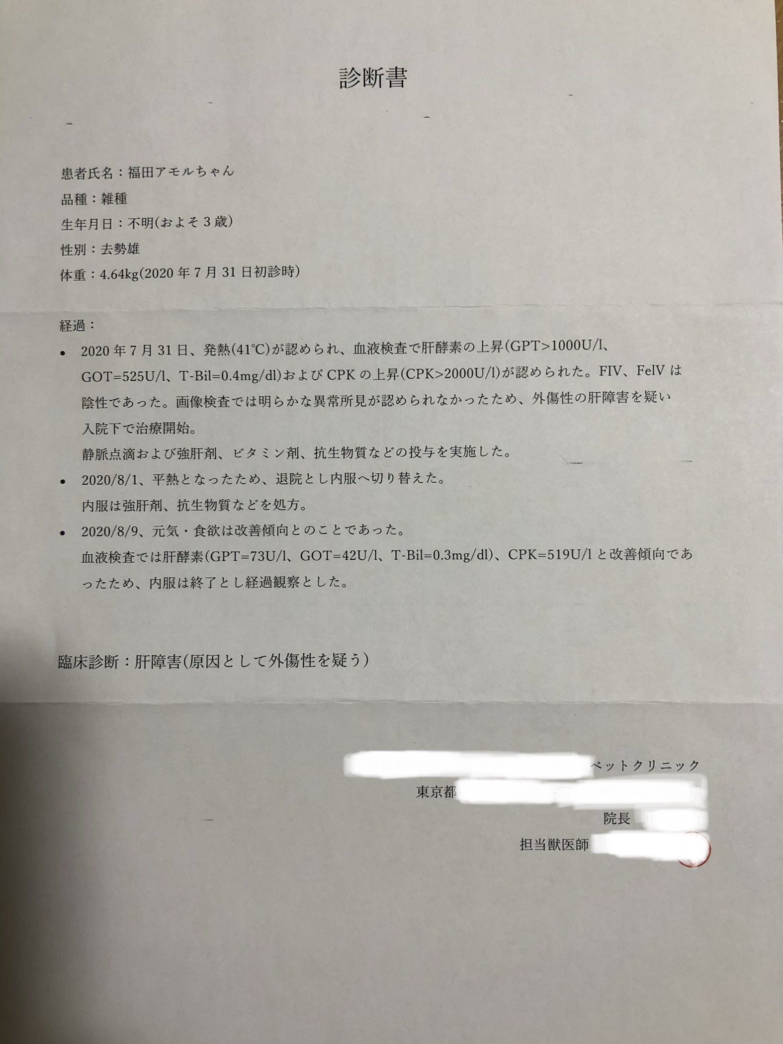 2匹を病院に連れていき、診断の結果は・・・アモル君は、腹部に暴行された事が原因と思われる「外傷性の「肝障害」と41℃と発熱もありました。(猫の平熱は38度らしく、40度を超すのは異常と)