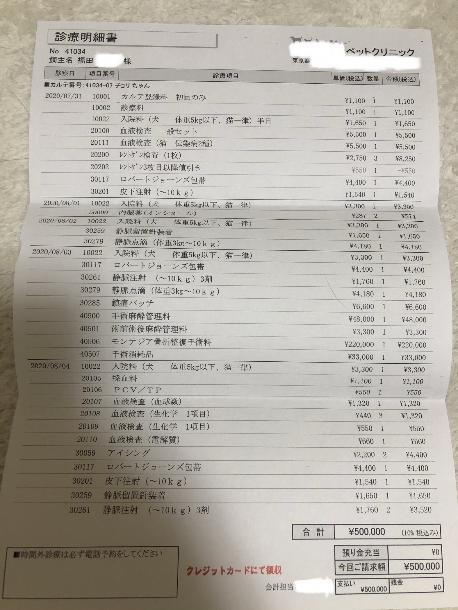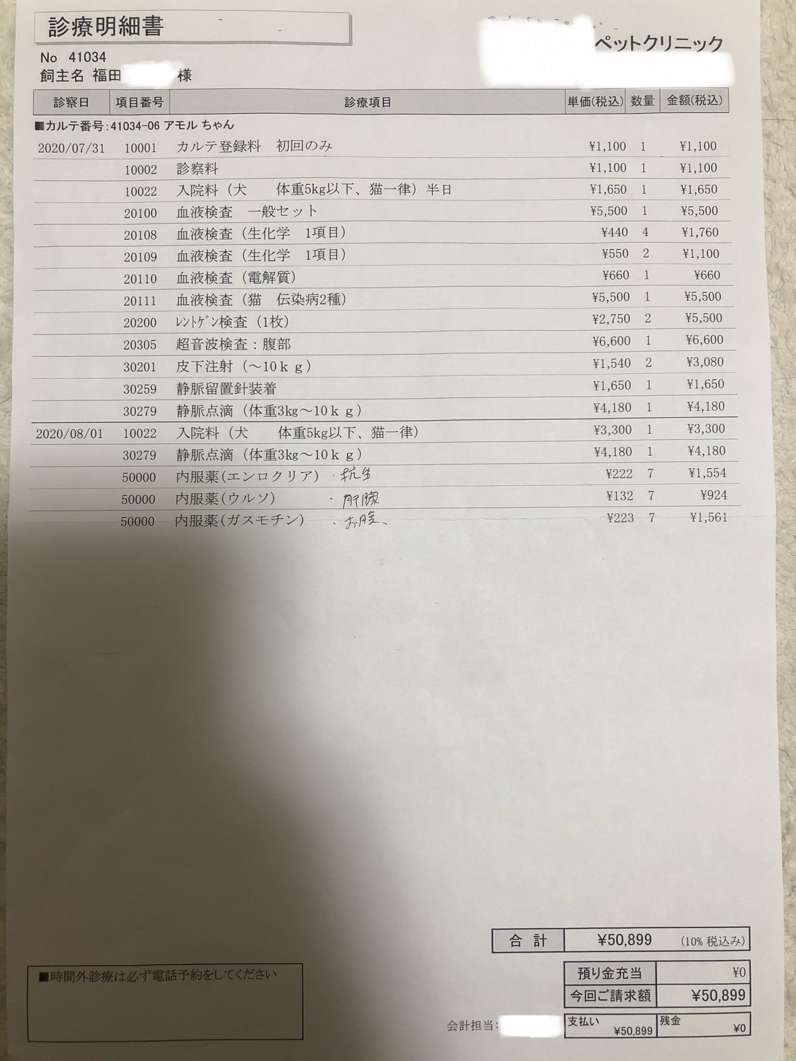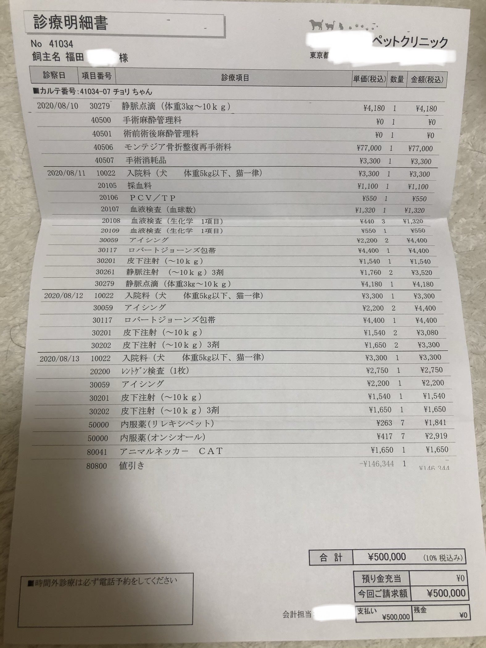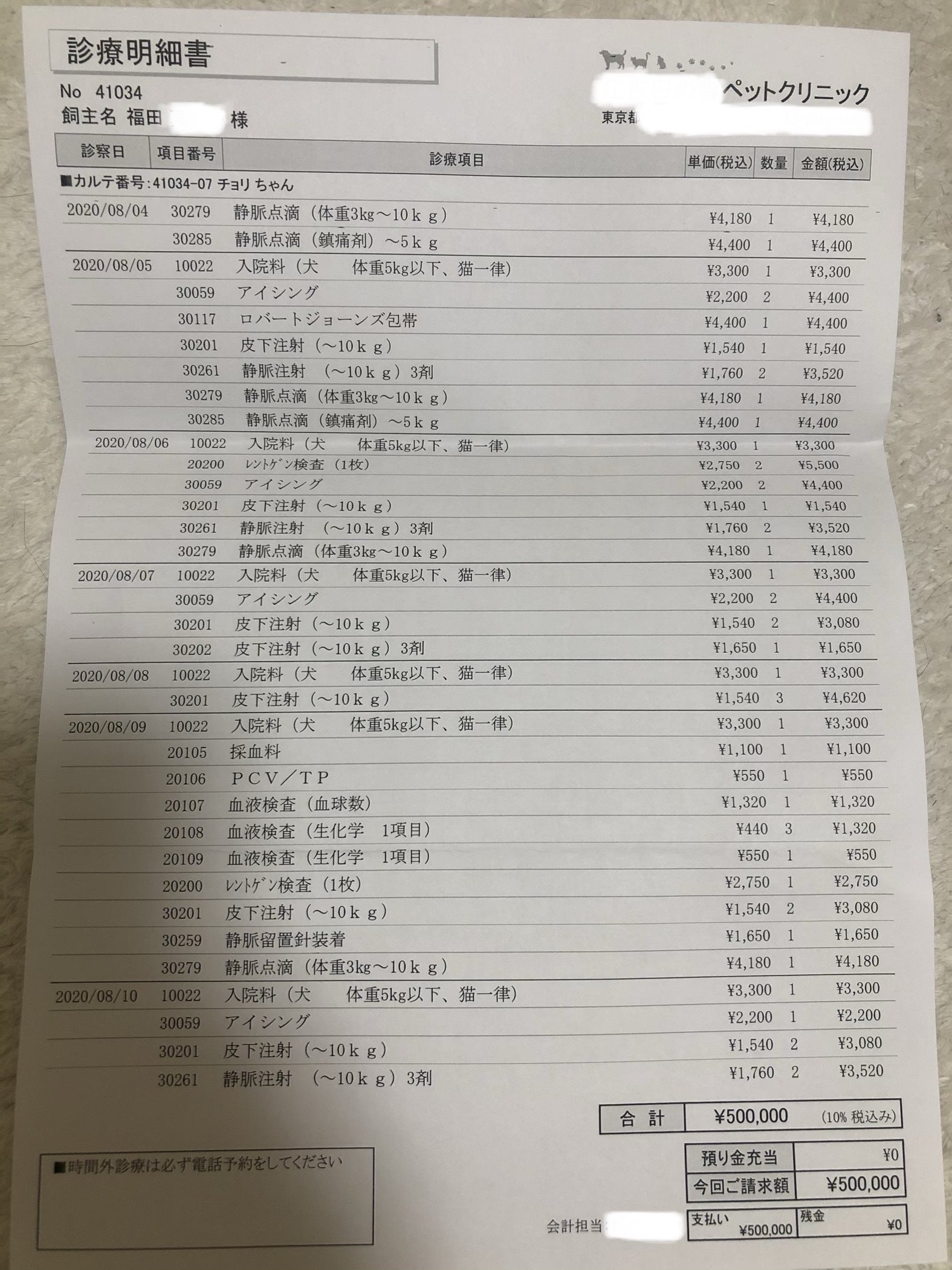 奇跡的にも短期の入院・自宅療養で異常な内蔵数値は健常な数値まで下がり、内面の治療は終わりました。ですが、その短期入院の間でも様々な投薬等が必要であった為、約5万円の治療費が掛かっています。