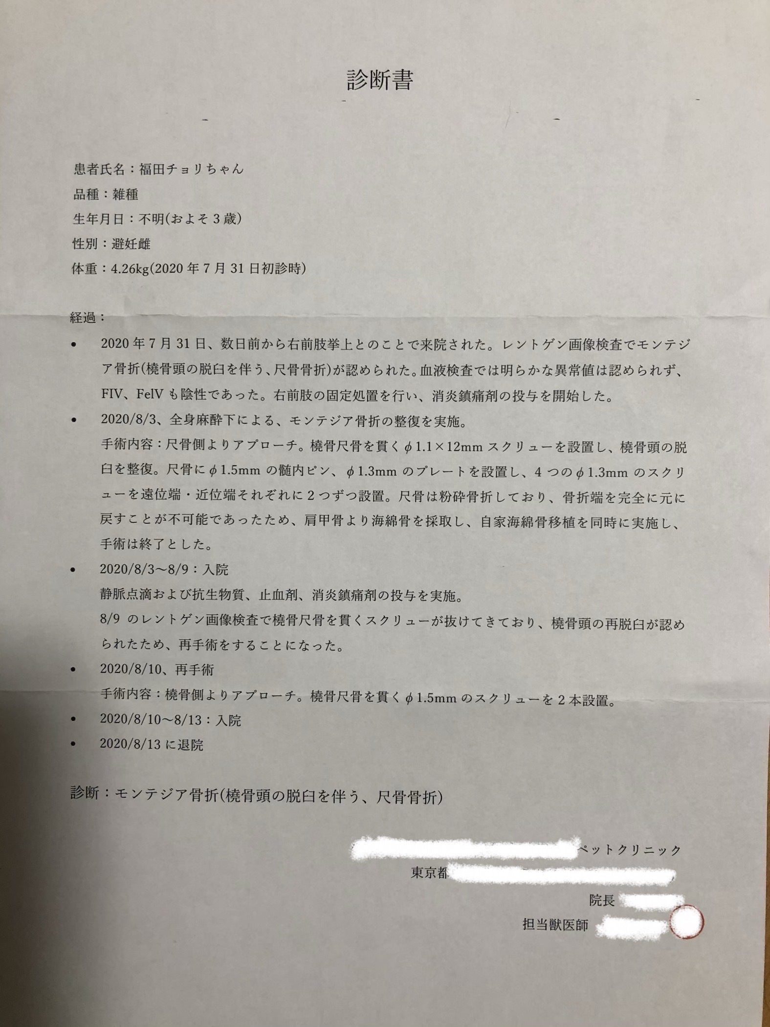 同年08月03日 チョリの「モンテジア骨折」の整復手術実施、無事終了。ここから1週間入院となる。