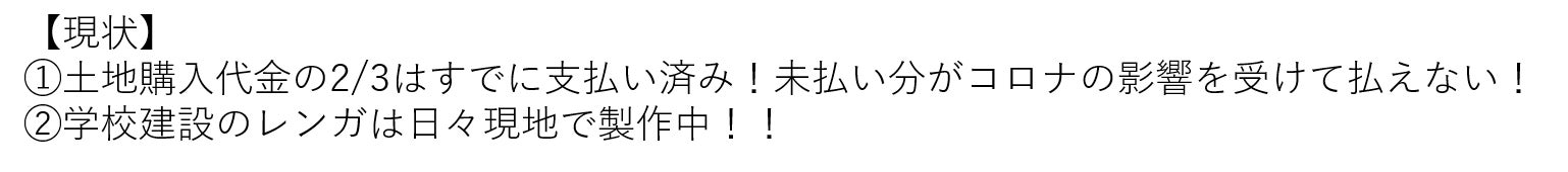 土地を購入したことで、学校建設のためのレンガ作りを開始しました。ローンの返済は、私たちが例年行っているチャリティーイベントの利益を補てんする予定でしたが、新型コロナウイルスの影響を受け、すべてのイベントが中止となり、ローンの返済が困難な状況になりました。
