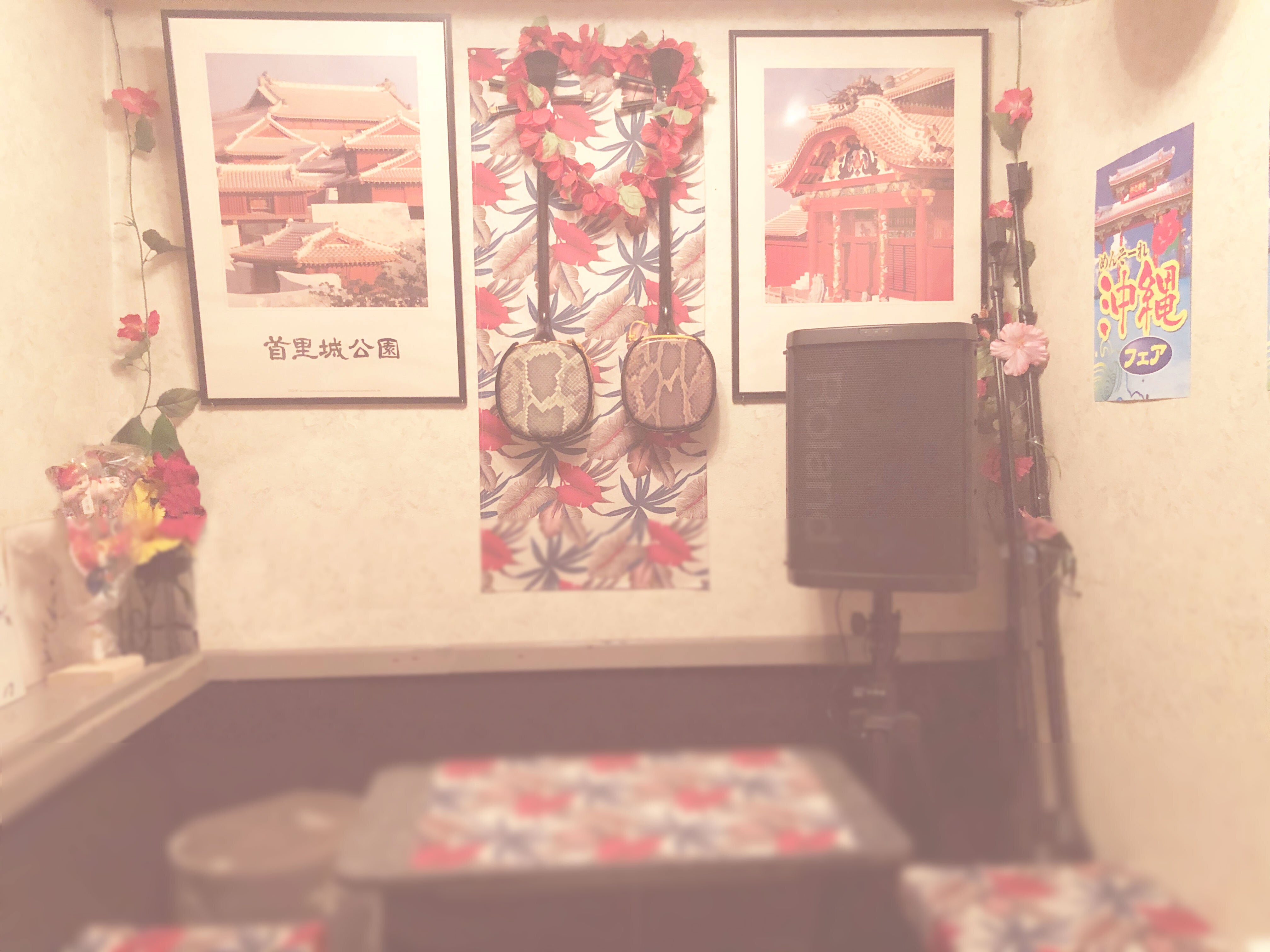 店内では、沖縄料理やお酒がお楽しみいただけます。カラオケシステム搭載し、ちょっとしたミニライブ感覚で沖縄の歌を歌ったり、わたくし自身もリクエストにお応えして歌わせていただくこともございます。三線もご用意しておりますので、ちょっと弾くだけでも沖縄の風を感じる空間になっています。
